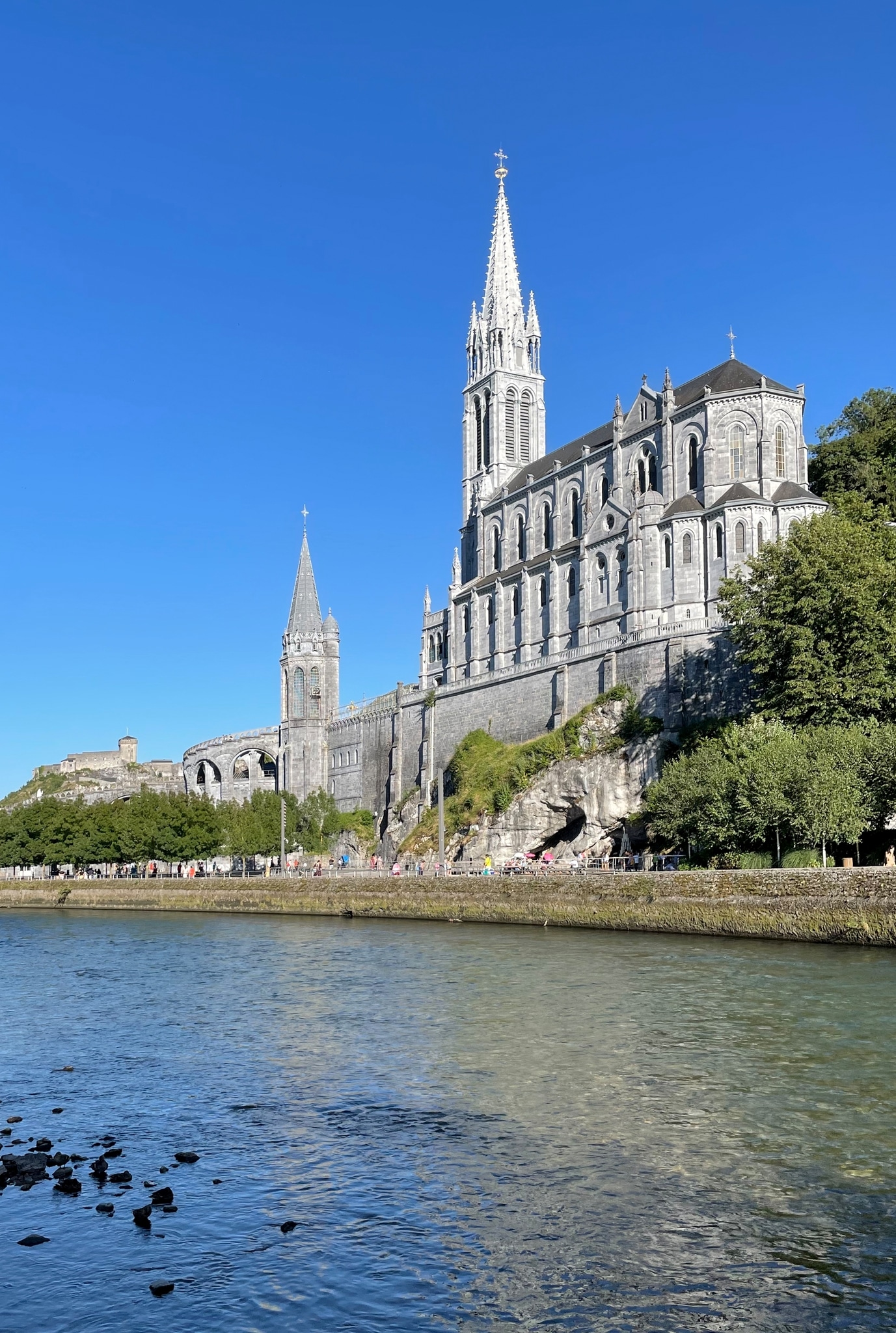 Neugotische Kirche, die 1862–1872 auf dem Felsen über der Grotte von Massabielle errichtet wurde, in der von Februar bis Juli 1858 die Jungfrau Maria achtzehn Mal der 14-jährigen Bernadette Soubirous (1844–1879) erschienen sein soll, worauf Lourdes in kürzester Zeit zum wichtigsten Wallfahrtsort Frankreichs wurde. Die durch Spenden finanzierte Kirche wurde 1871 gesegnet, drei Jahre später erhielt sie den Ehrentitel einer “Basilica minor”, 1876 erfolgte in einem grossen Festakt die Weihe. Die Pläne lieferte der Diözesanarchitekt Hippolyte Durand (1801–1882). Das Gebäude, inspiriert von Sakralbauten des des 12. und 13. Jahrhunderts, wurde aus grauem Stein über einer Krypta errichtet, in der 1866 die erste Messe stattfand. Hauptfassade mit Vorhalle und Glockenturm mit Spitzhelm. Das Kirchenschiff hat beidseits fünf Seitenkapellen; ein ausladendes Joch vor dem Chor deutet ein Querhaus an. Chor mit Umgang und fünf weiteren Kapellen. Über den Hauptarkaden von Kirchenschiff und Chor verläuft eine Blendarkade. Die umfangreiche Glasmalerei-Ausstattung der Kirche wurde in drei Etappen in den 1870er Jahren im Glasmalerei-Atelier Gsell-Laurent in Paris hergestellt.