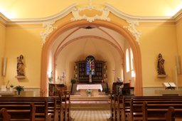 Thévoz réalise également les vitraux des quatre fenêtres du choeur et Faravel un vitrail dans la sacristie, laquelle a été reconstruite par Dumas en 1939 suite à l'incendie qui l'avait détruite en 1921 (Pittet, [2020], p. 101, 110). Jusqu'en 1976-1977, le choeur était orné d'un dais formé de deux colonnes torses soutenant un entablement en volutes surmonté d'une couronne au centre, rappelant la structure imaginée par Dumas en 1927 à l'église d'Echarlens pour porter le retable brodé de Marguerite Naville. Sans doute jugé trop imposant, ce décor architectural en bois a été démonté et déposé lors de la rénovation entreprise entre 1975 et 1977 (Pittet, [2020], p. 186). Le décor peint originel conçu par Faravel, comprenant des symboles eucharistiques sur l'arc du choeur et des Évangélistes autour de la clé de voûte a été partiellement préservé (Diesbach, 1939, p. 57).