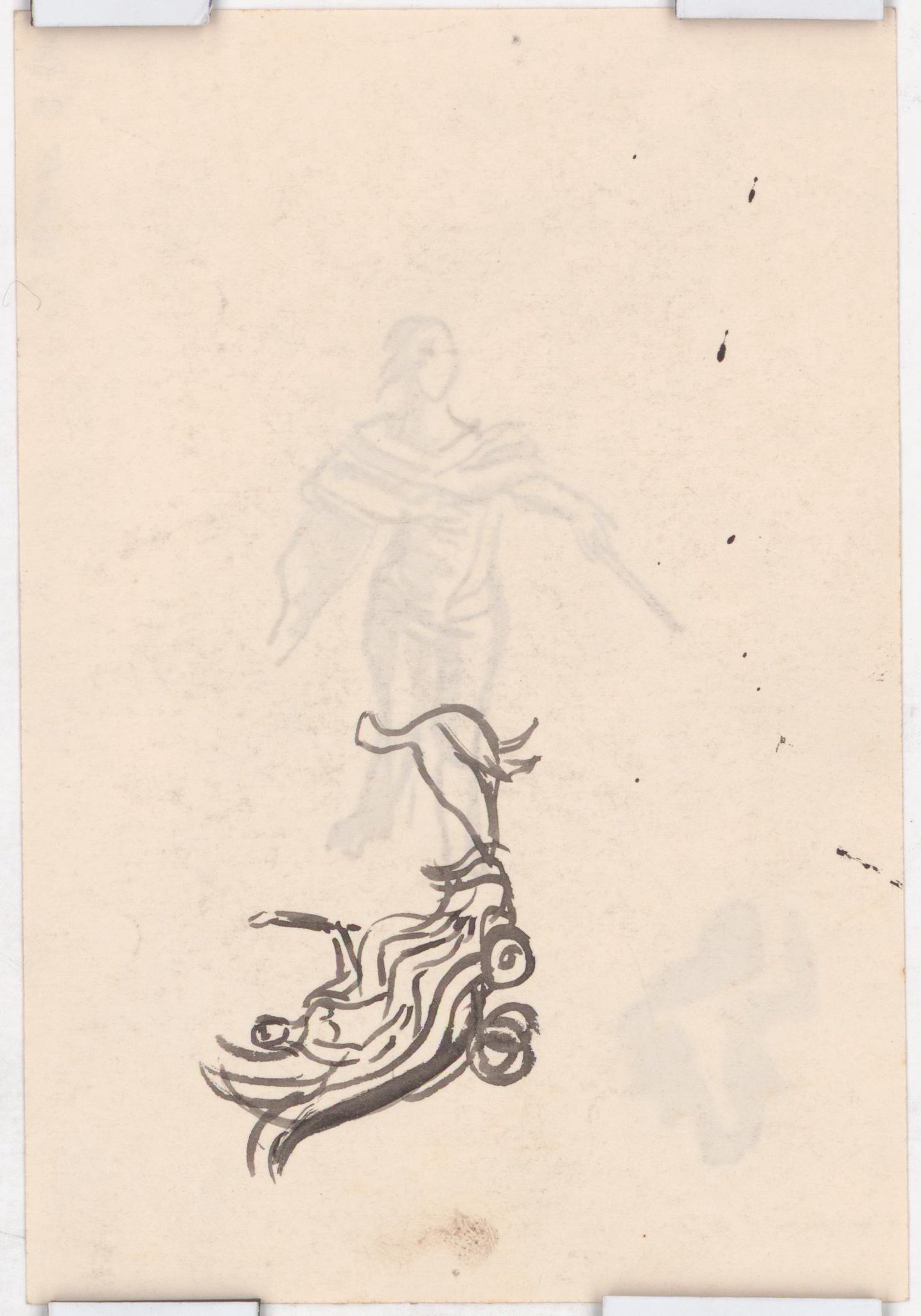 MP_08.90: Verso : esquisse d'une figure féminine assise dans un char tiré par un oiseau.