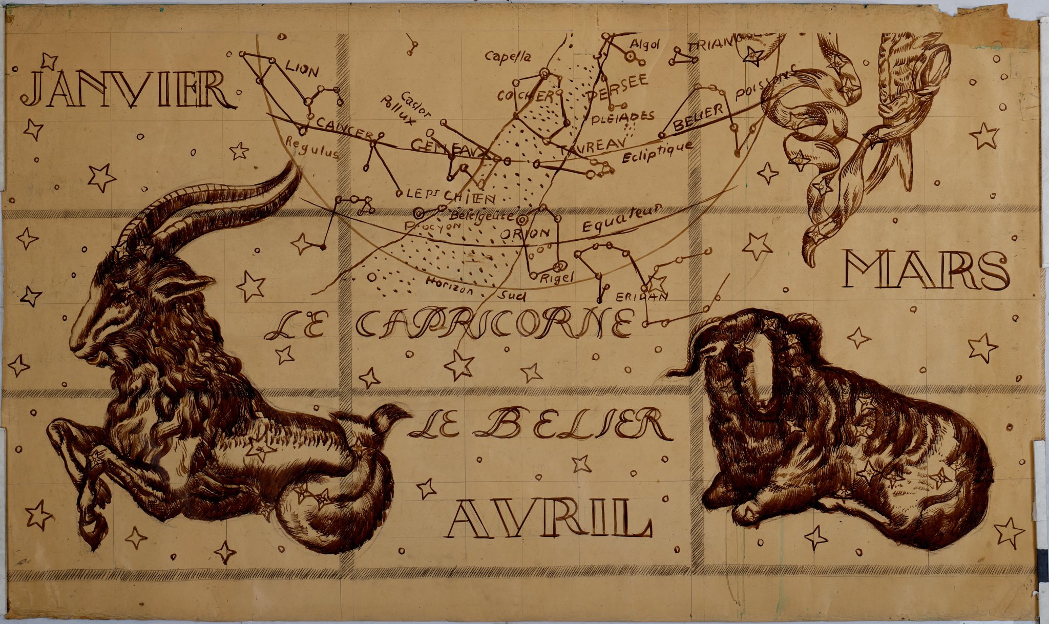 Carte du ciel avec au recto le Taureau et le Lion en couleur et au verso le Capricorne et le Bélier en noir et blanc.