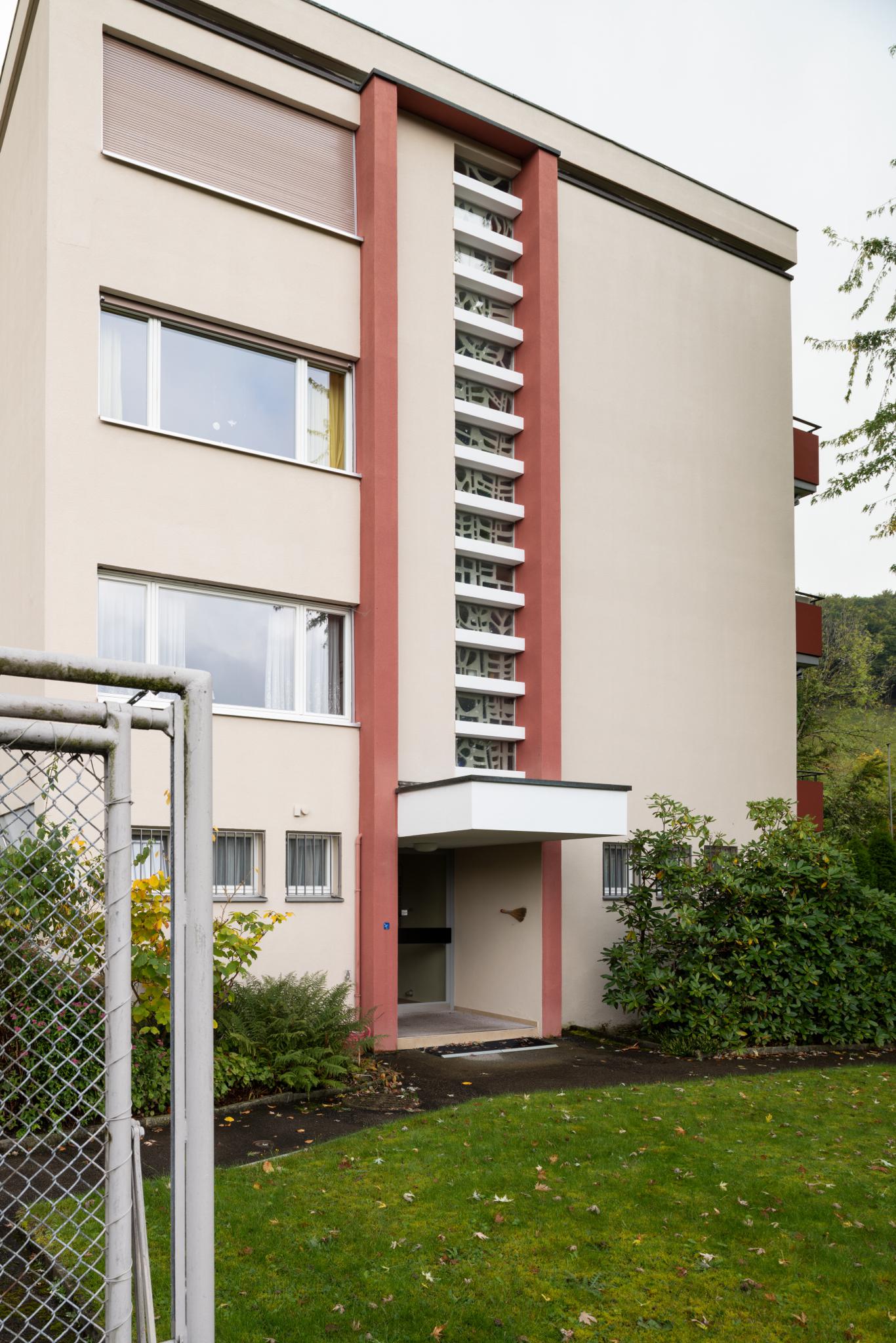 Wohnhaus Spiltrücklistrasse mit der Betonverglasung von Heinrich Stäubli