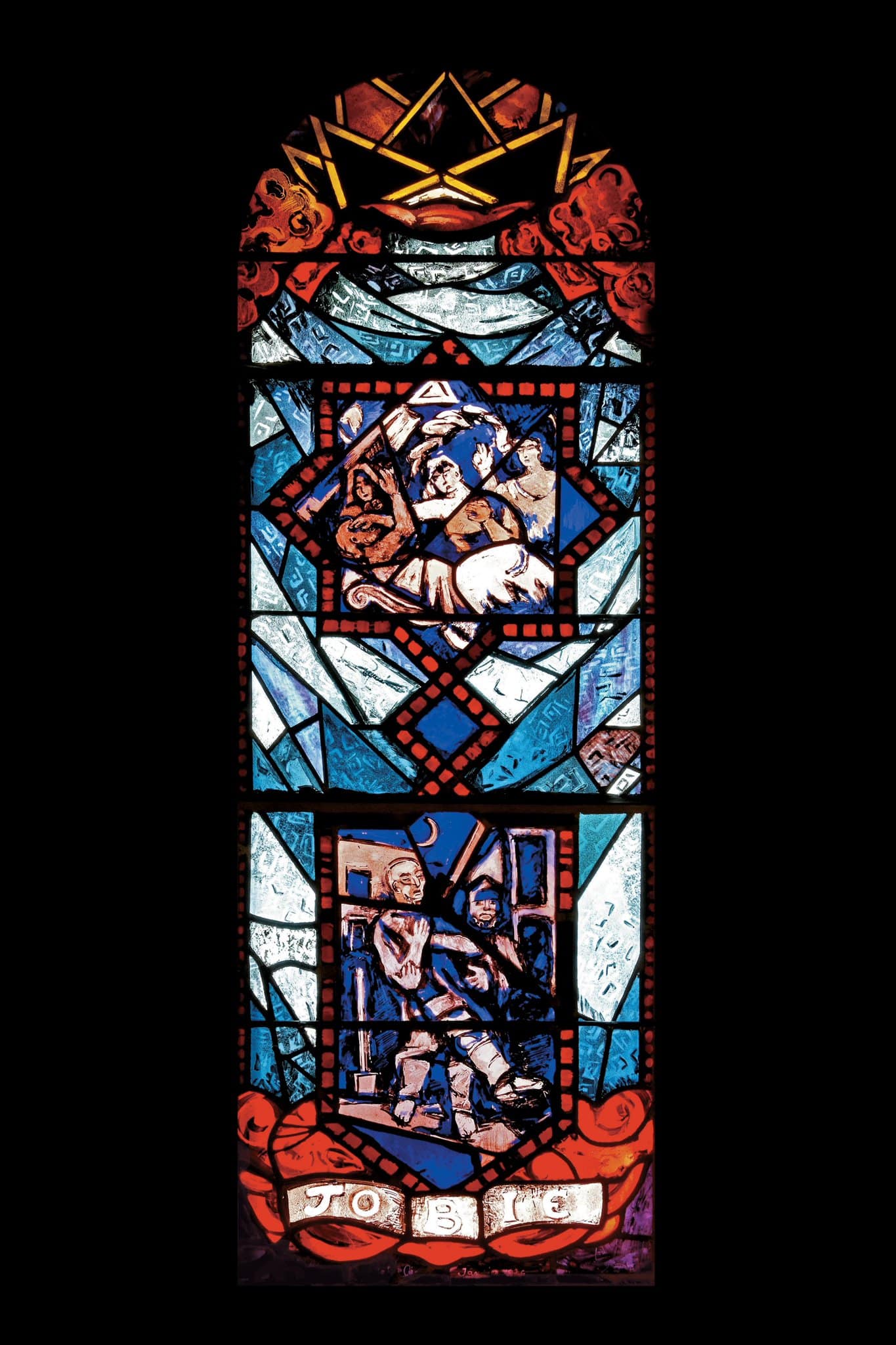 Pour définir les sujets à représenter sur les quatre baies du vestibule, l’artiste discute avec l’architecte et Antoine Jacquet en décembre 1925 à Saint-Paul. Après de longs échanges, il est décidé d’évoquer deux épisodes marquants de la vie de Joseph, Jacob, Tobie et Job en deux registres superposés ([Jacquet], 1925). Pour leur composition, Cingria s’inspire des vitraux français en médaillons des XIIIème et XIVème siècle avec bordure (Cingria, s. d.). Techniquement, il choisit le verre doublé gravé à l’acide pour les sujets narratifs et un travail au pochoir et à la main pour l’ornementation (Cingria, s. d.). Il vient d’utiliser le même procédé à Semsales pour les fenêtres du chœur (par exemple, (GSL_71), et le reprendra pour les vitraux de la nef d’Echarlens (par exemple, GSL_134) et pour les verrières hautes de Finhaut en 1929 (par exemple GSL_117).