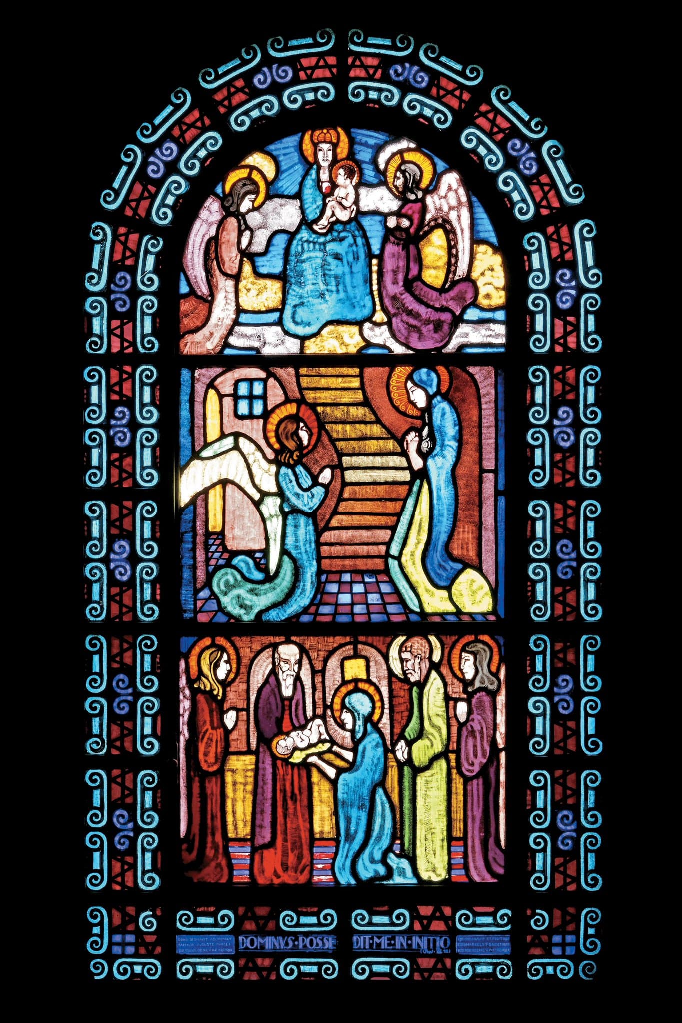 Pour sa première grande commande, Poncet livre donc un travail pensé dans les moindres aspects, reflétant une recherche d’équilibre et de sens à tous les niveaux. Le style de ses trois vitraux manifeste un mélange d’influence hodlérienne (Poncet suit en 1915 des cours du soir à l’École des Beaux-Arts avec Hodler), et Art nouveau dans l’emploi de formes douces et sinueuses, d’ornements végétaux stylisés. La présence de Maurice Denis sur le chantier, figure que le jeune artiste devait admirer, n’y est certainement pas étrangère. Poncet se distingue cependant de la mouvance Art nouveau par son refus d’employer des verres opalescents ou à textures (verres dits “industriels”), leur préférant du verre “à l’antique” (c’est-à-dire fabriqué selon les techniques traditionnelles du soufflage du verre en manchon), dans un désir de renouer avec l’art du vitrail médiéval (Noverraz, 2014, p. 21-27).