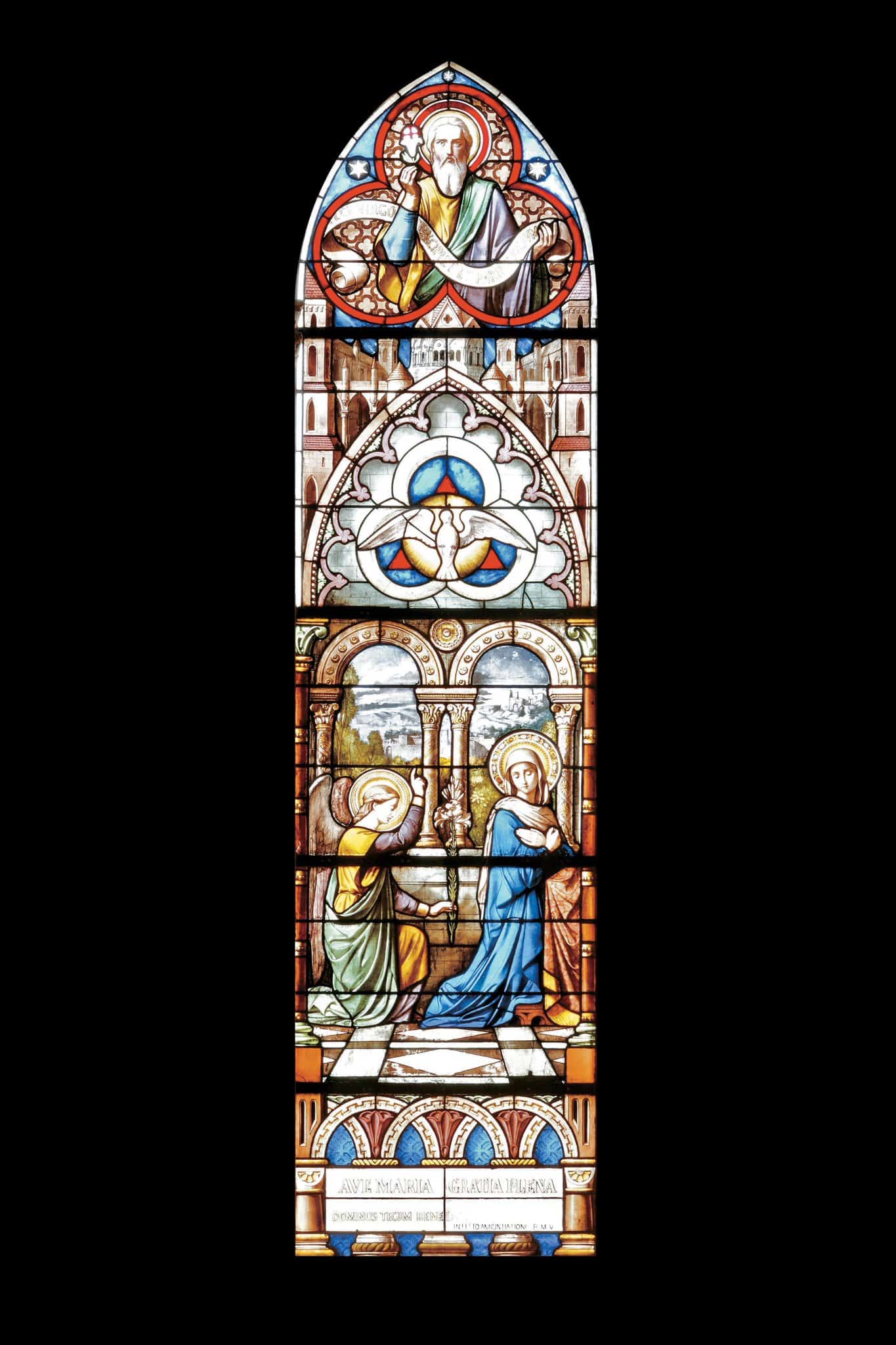 IZAIAS (nimbe) / ECCE VIRGO CONCIPIET ET PARIET FILIUM (banderole) / AVE MARIA GRATIA PLENA / DOMINUS TECUM BENEDICTA TU IN MULIERIBUS / IN FESTO ANNUNTIATIONIS B.M.V. (LUC 1.28) (cartouche en bas)