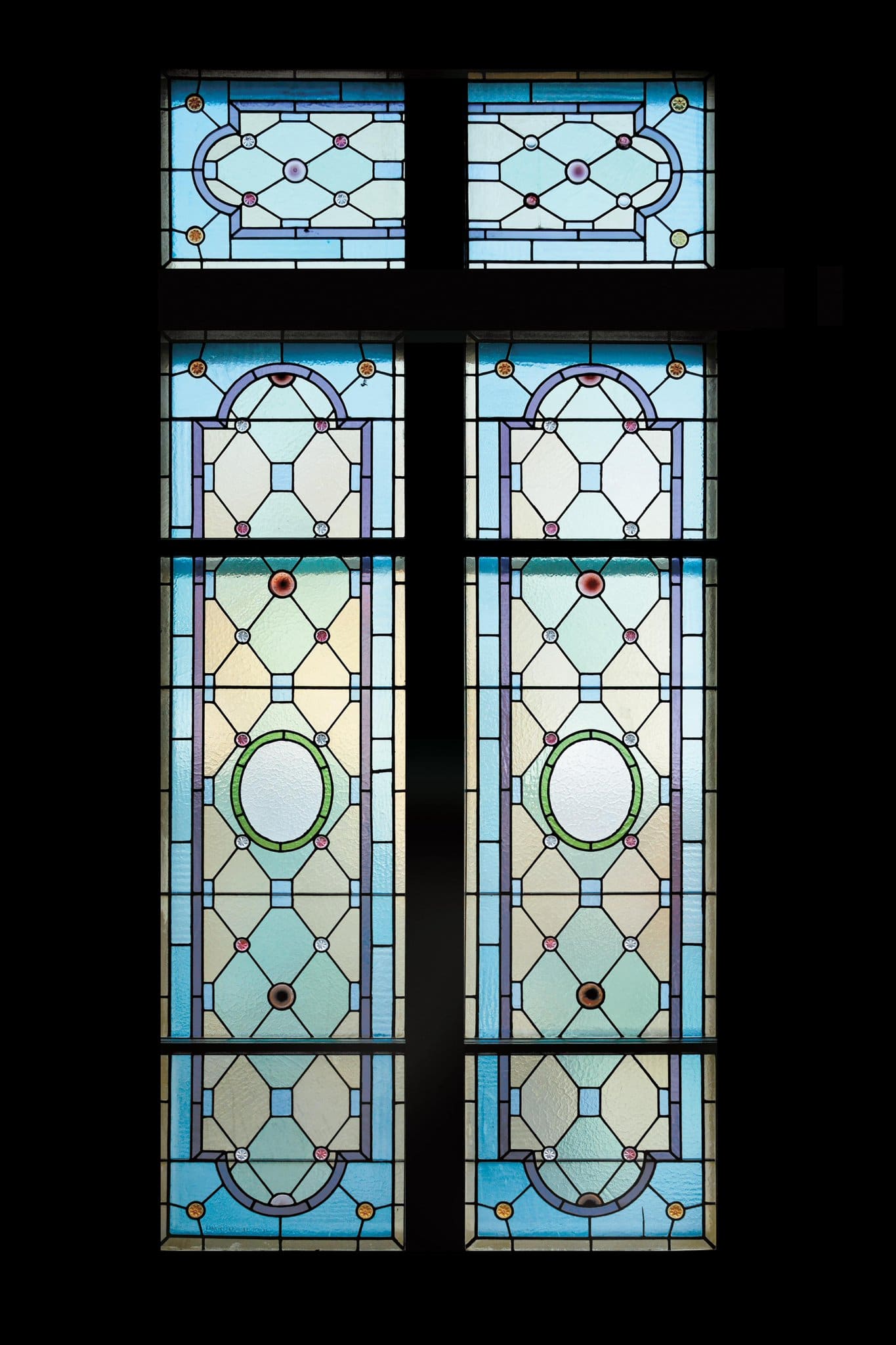 Motifs géométriques avec des cabochons et un médaillon sur chaque vantail