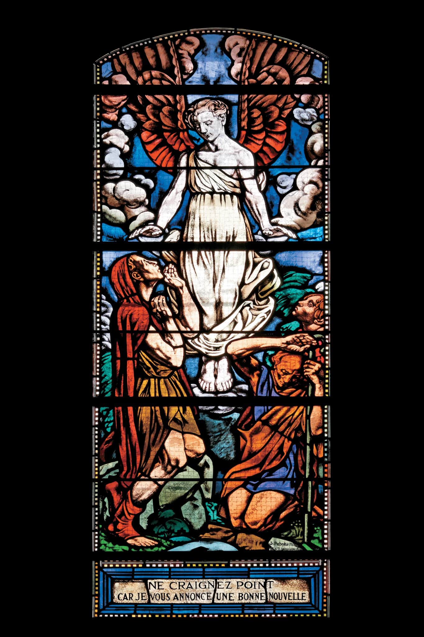 Un ange annonce la bonne nouvelle à trois bergers effrayés.