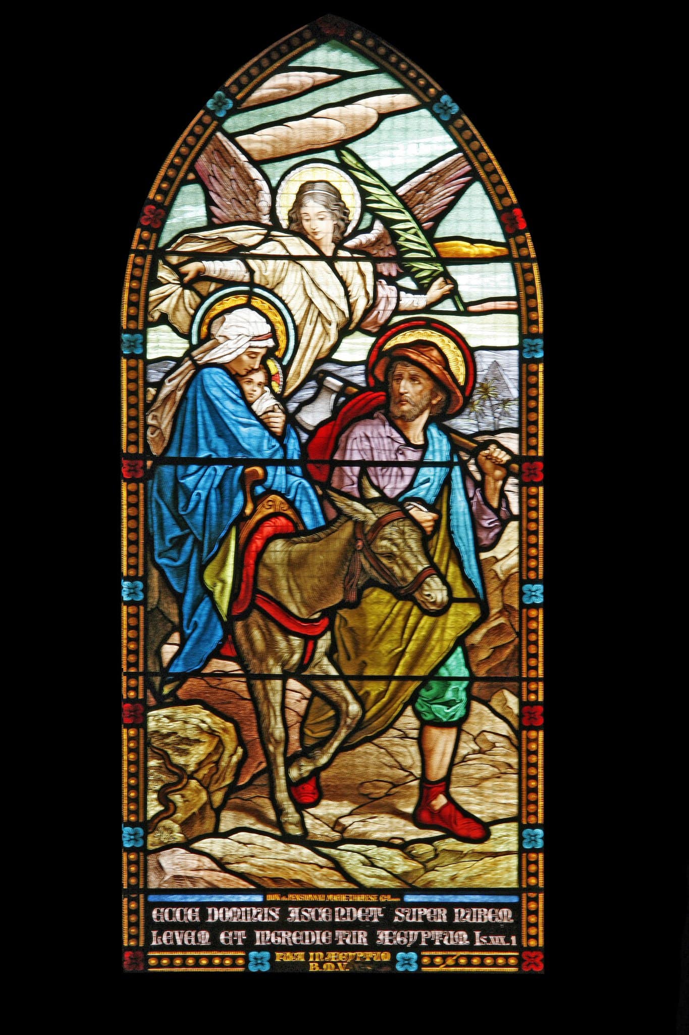 Sous le regard d’un ange, Marie est assise sur un âne et porte l’Enfant Jésus. Joseph est debout à leurs côtés.