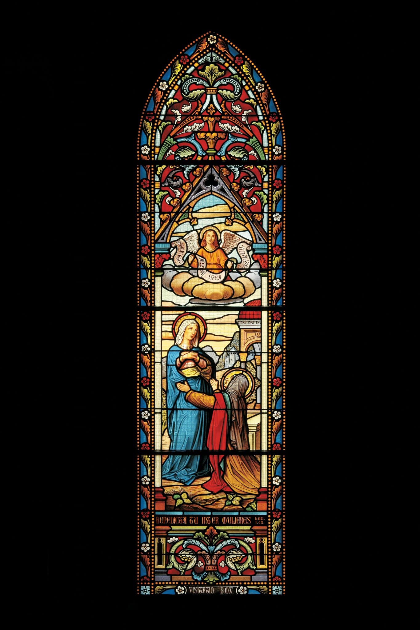 MAGNIFICAT ANIMA MEA DOMINUM (banderole de l’ange) / BENEDICAT TU INTER MULIERES LUC / I.42 (bandeau sous la scène) / VISITATIO B.M.V. (cartouche sur la bordure en bas au centre)