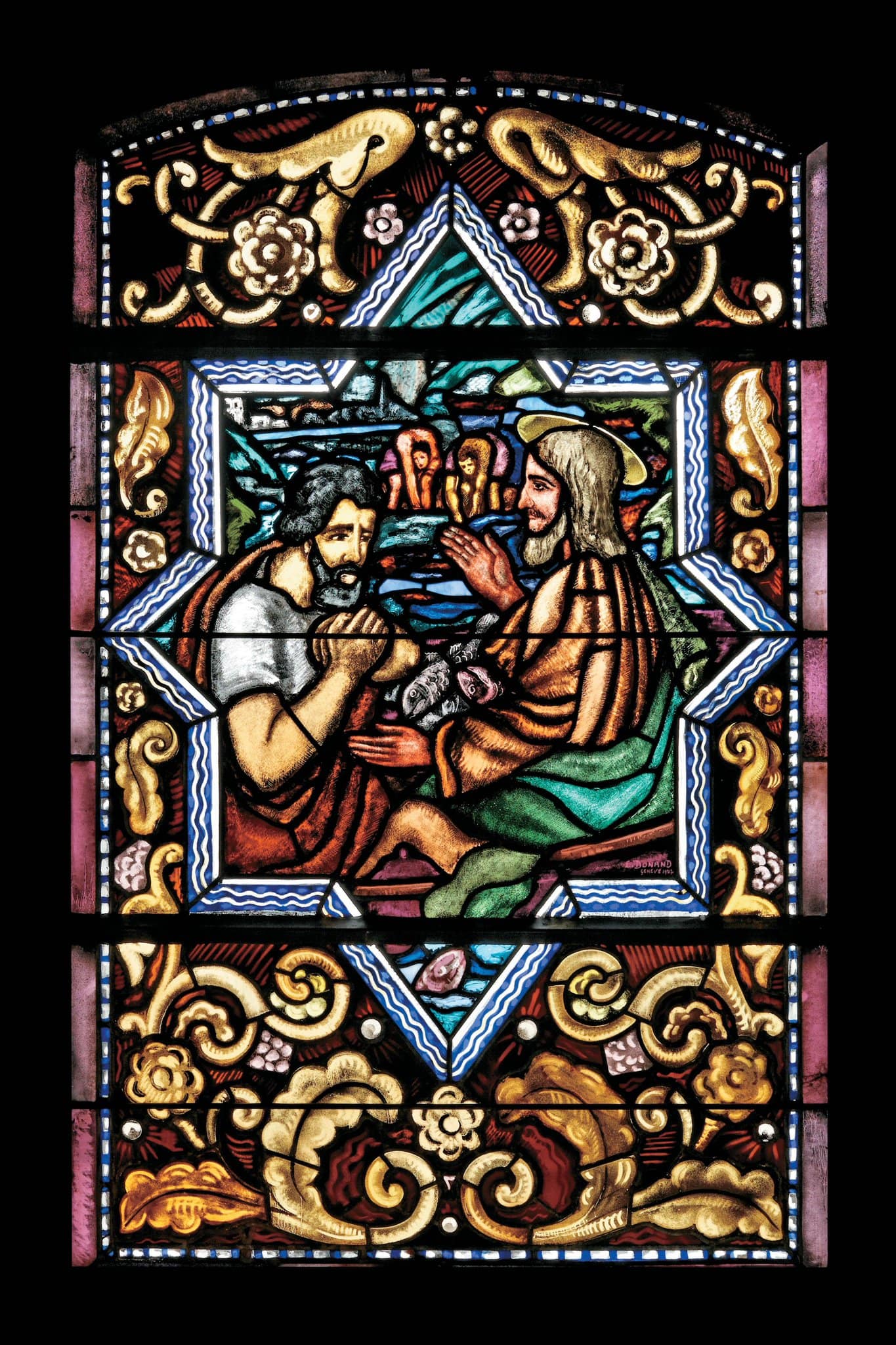 Jésus et saint Pierre sont assis dans une barque pleine de poissons, alors qu’à l’arrière-plan des pêcheurs ramènent leur filet.