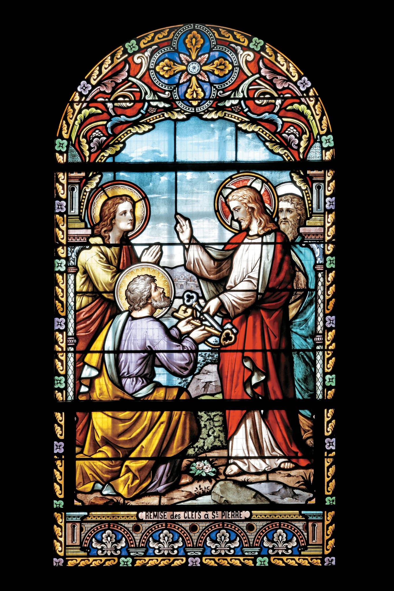 Le Christ remet les clefs à saint Pierre agenouillé devant lui, tout en le bénissant. Deux saints assistent à la scène.