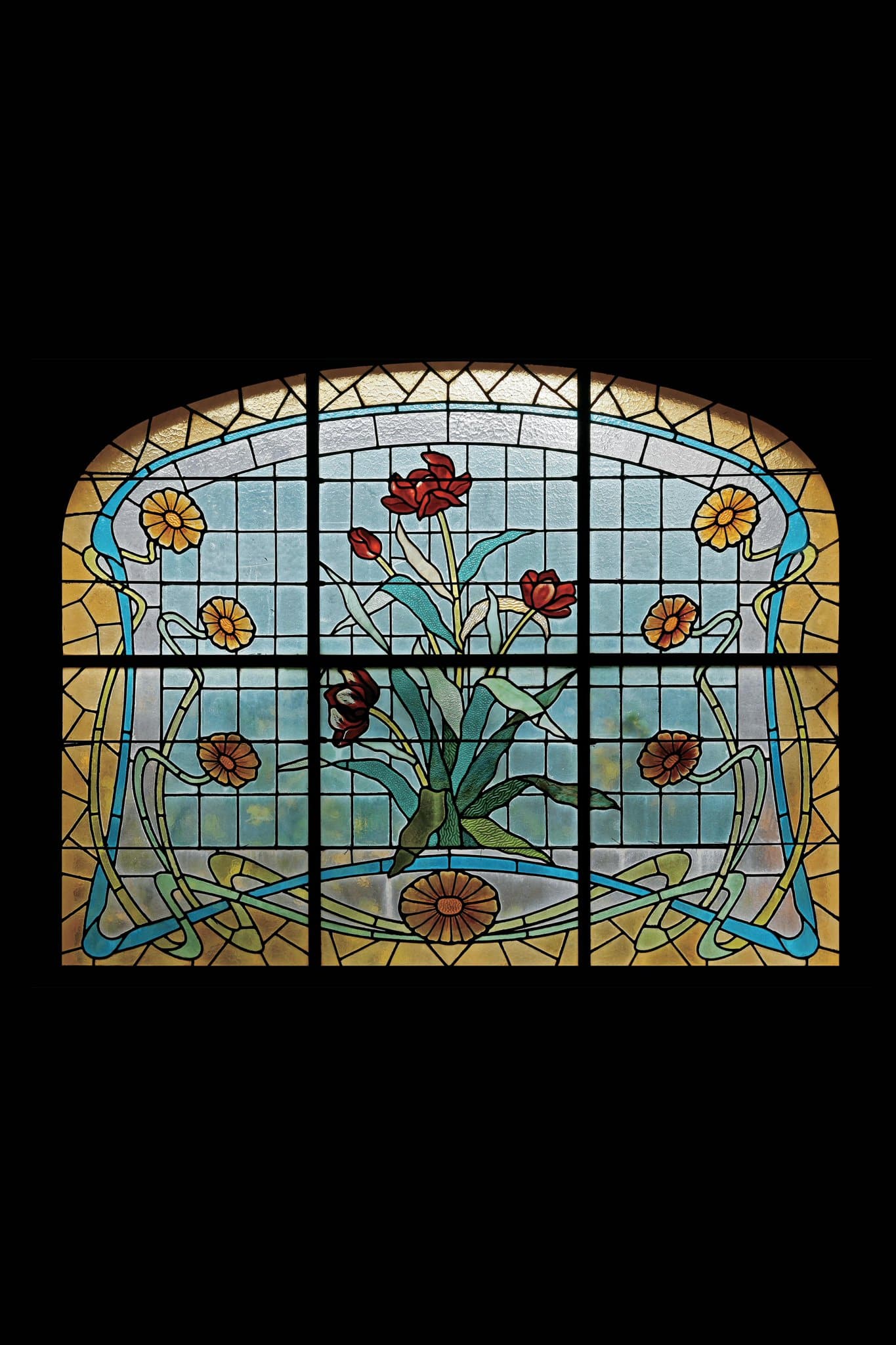 Une gerbe de tulipes est au centre, et des fleurs jaunes se déploient sur le cadre.