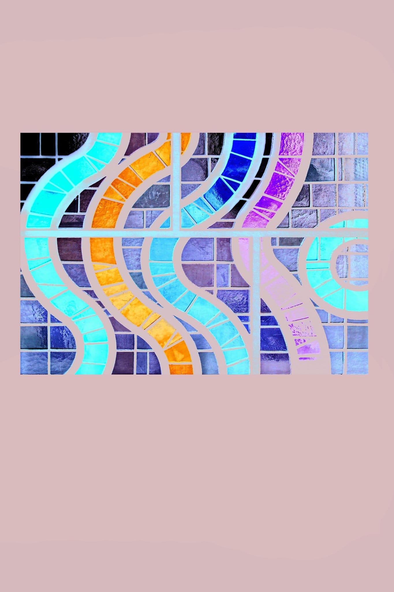 Dalle de verre composée de quatre courbes rouge, bleue, jaune et verte imbriquées les unes dans les autres et d’un disque jaune partiellement coupé sur fond blanc.