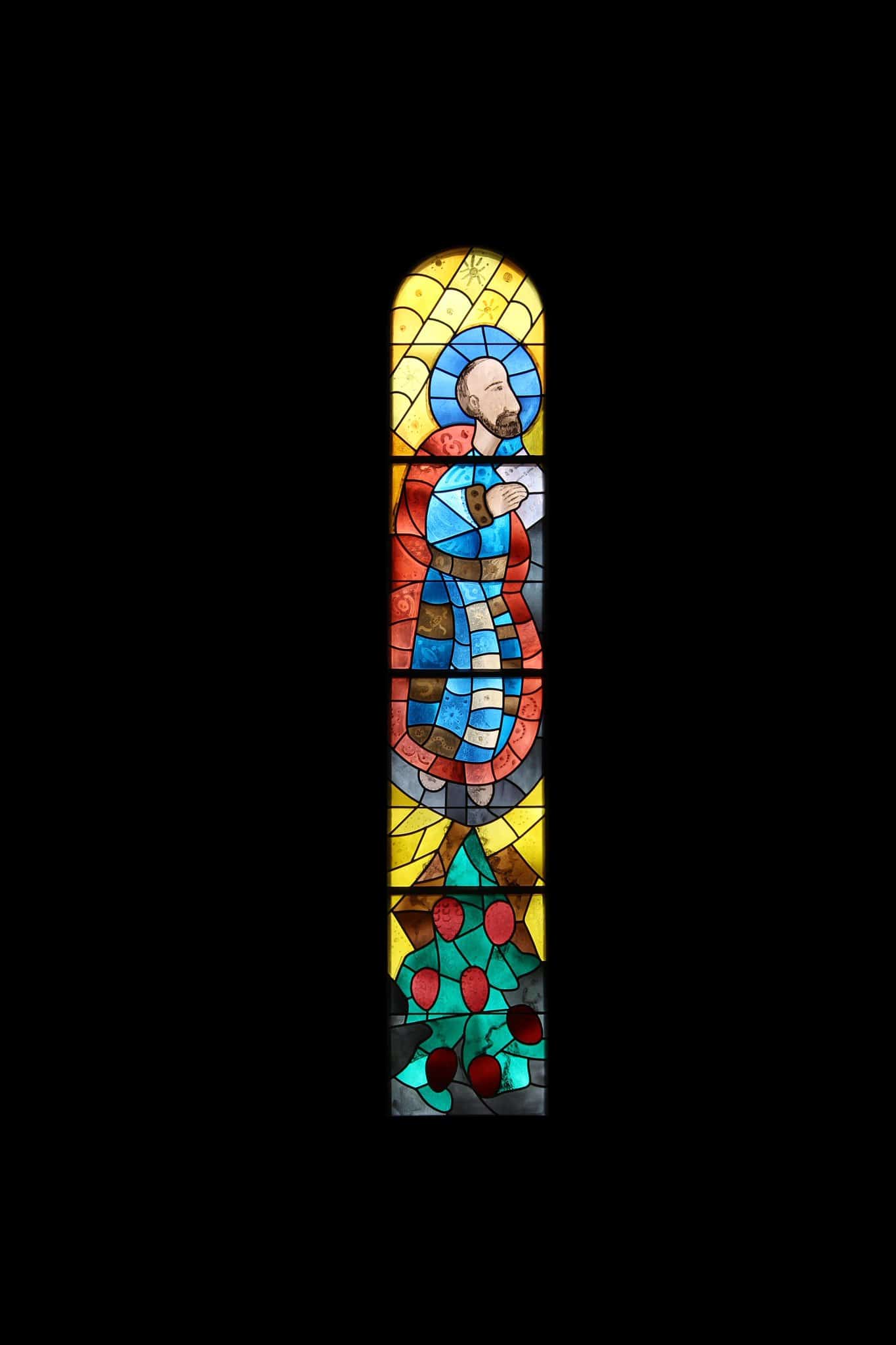 Moïse, présenté de profil et flottant au-dessus d’un sapin portant de grosses pives, tient les Tables de la Loi de sa main droite et regarde vers le Christ.