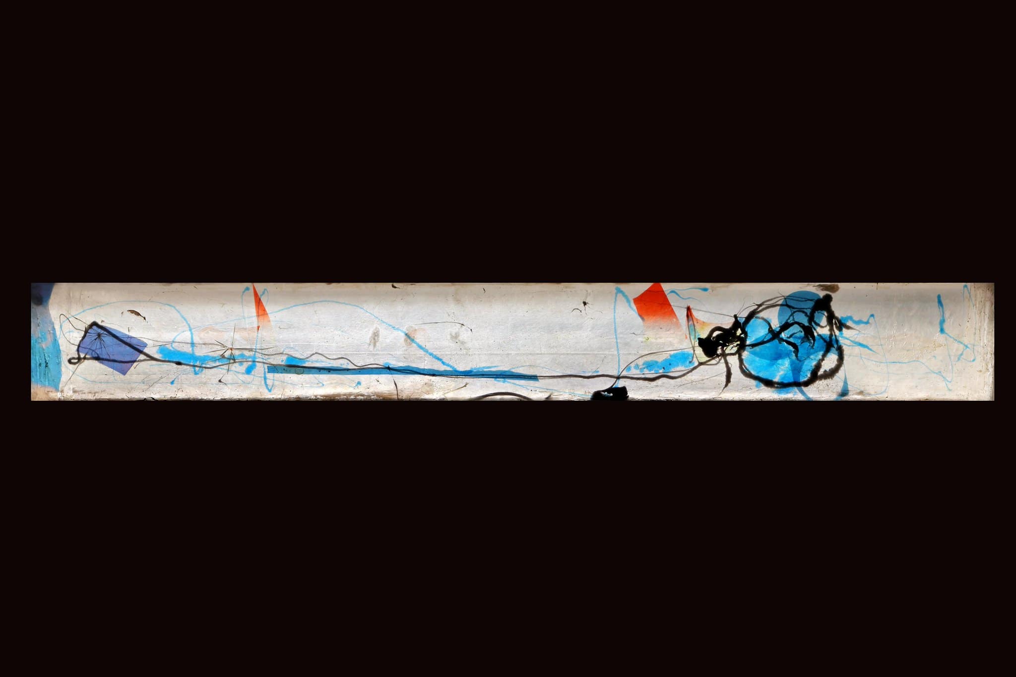 Un dessin et des lignes noires sur un décor orange et bleu sur fond blanc.