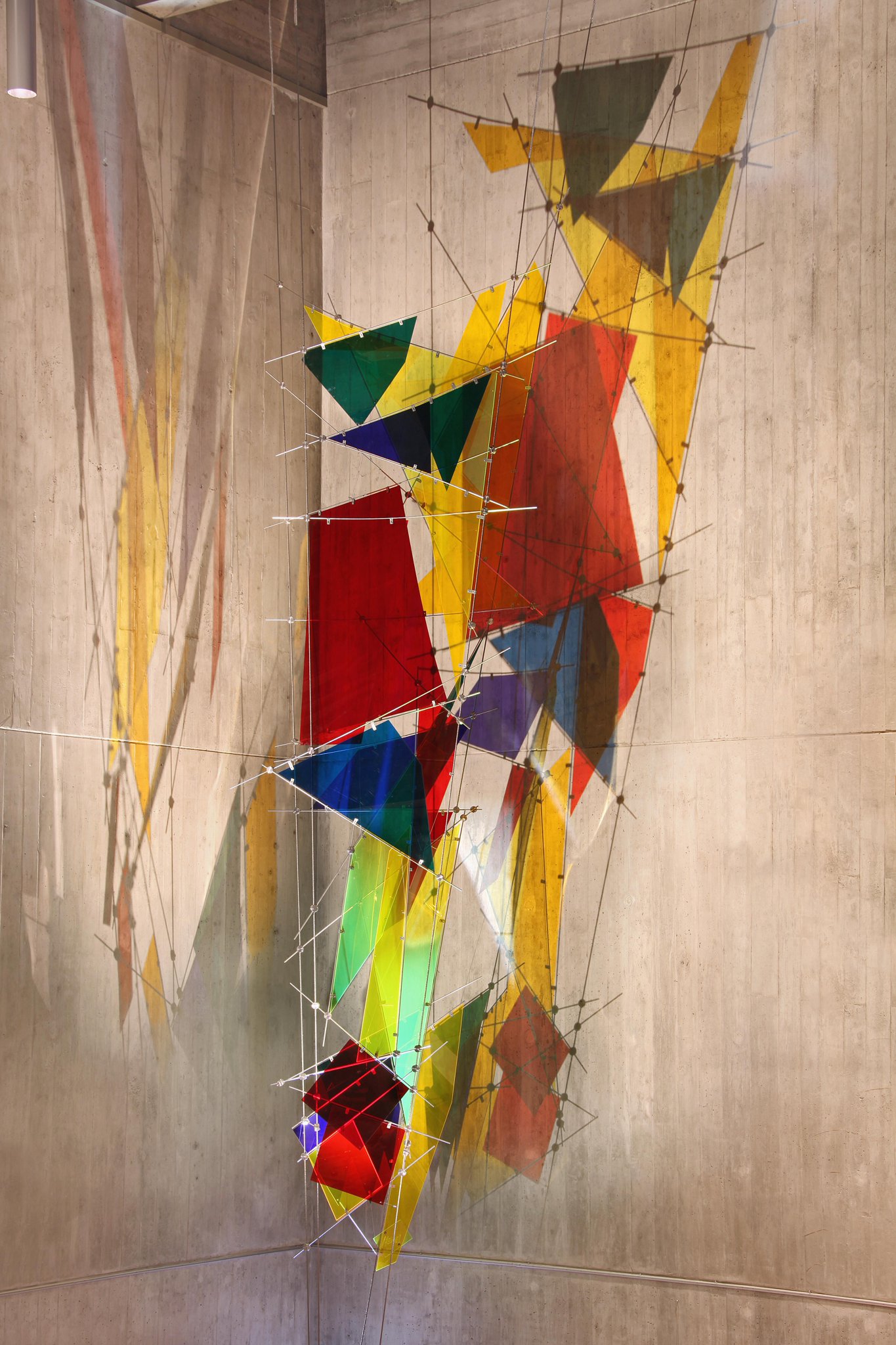 Des plaques rouges, jaunes, vertes et bleues cerclées de métal et suspendues par des câbles sont éclairées par des lampes projetant des reflets sur les murs et au plafond.