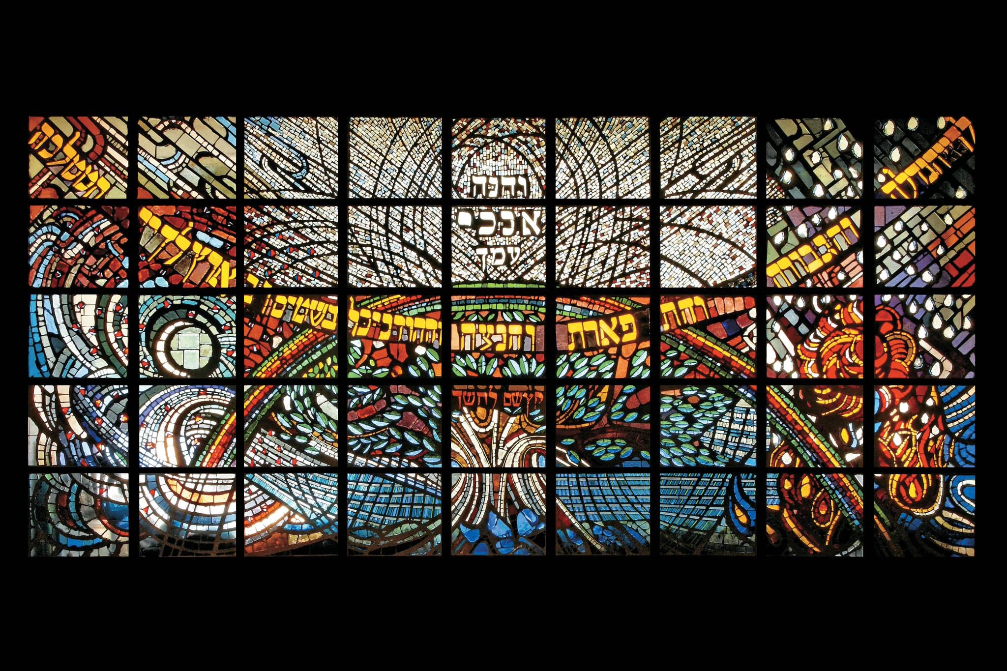 Dalle de verre composée de quarante cinq panneaux. Le chaos initial, la lune, le jaillissement du buisson ardent sous l’arc-en-ciel, le soleil, les flots et la manne céleste, le tout sous un ciel rayonnant et scintillant de mille étoiles sont un panorama des textes fondateurs.