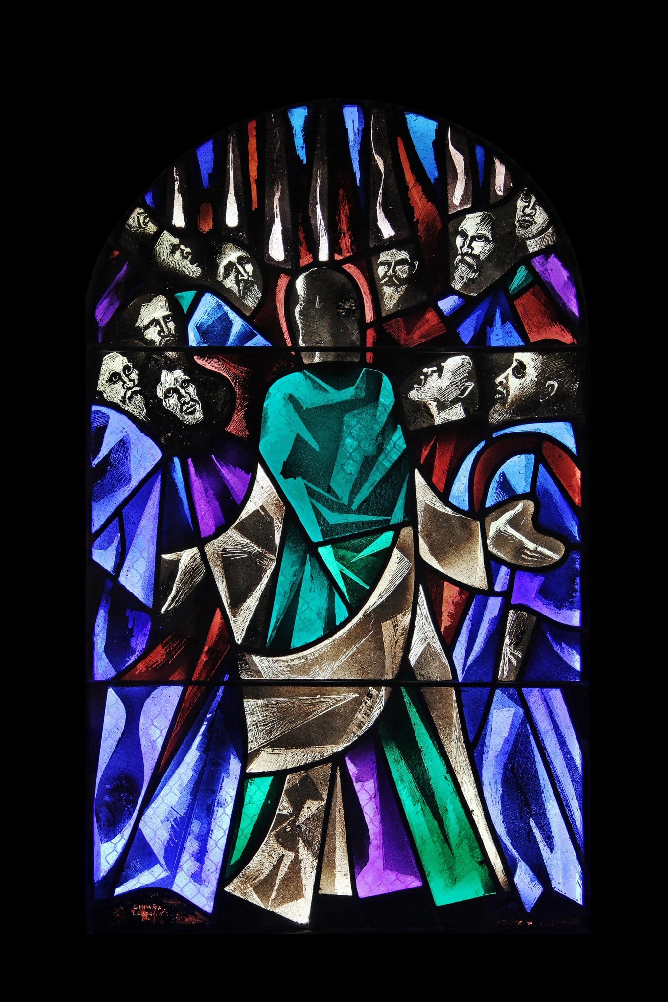 Douze apôtres, dont Pierre au premier plan, vu de dos et les mains ouvertes, reçoivent l’Esprit Saint descendant du ciel sous la forme de langues de feu.