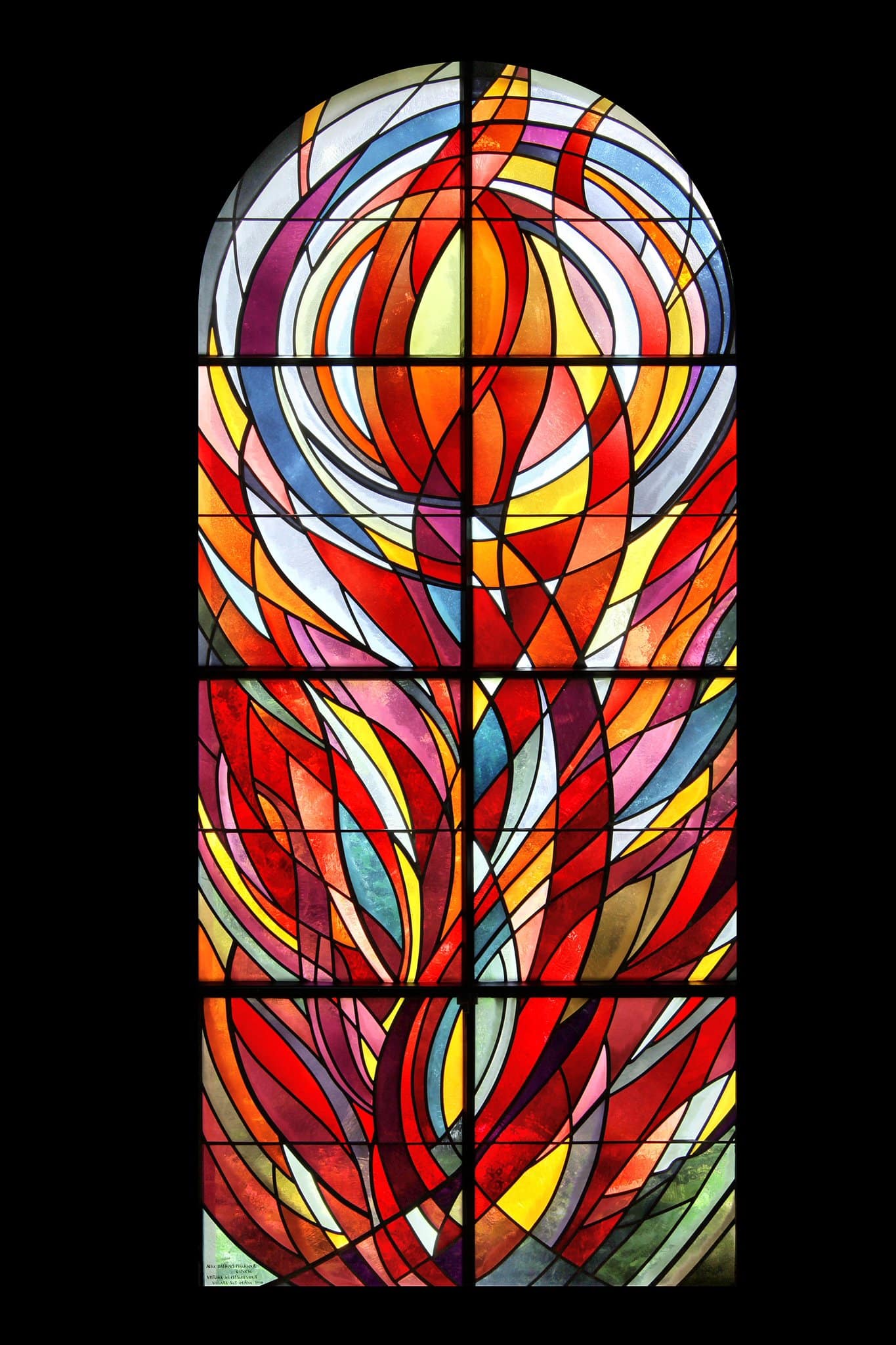 Source biblique : Second Livre des Chroniques 7, 1 : “Le feu descendit du ciel et la gloire du du Seigneur remplit la maison” (citation posée à côté du vitrail).