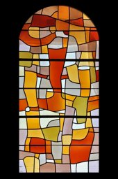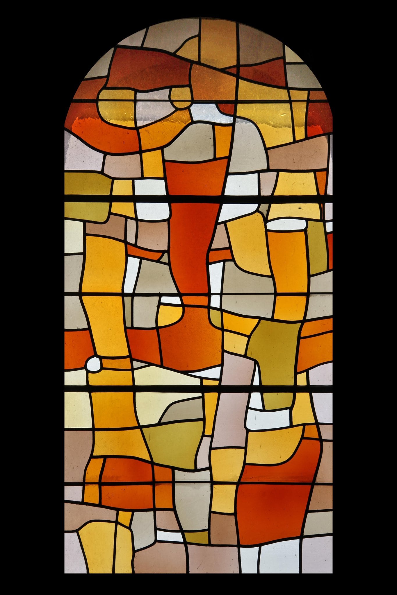 Vitrail non figuratif composé de verres oranges, jaunes et beiges.