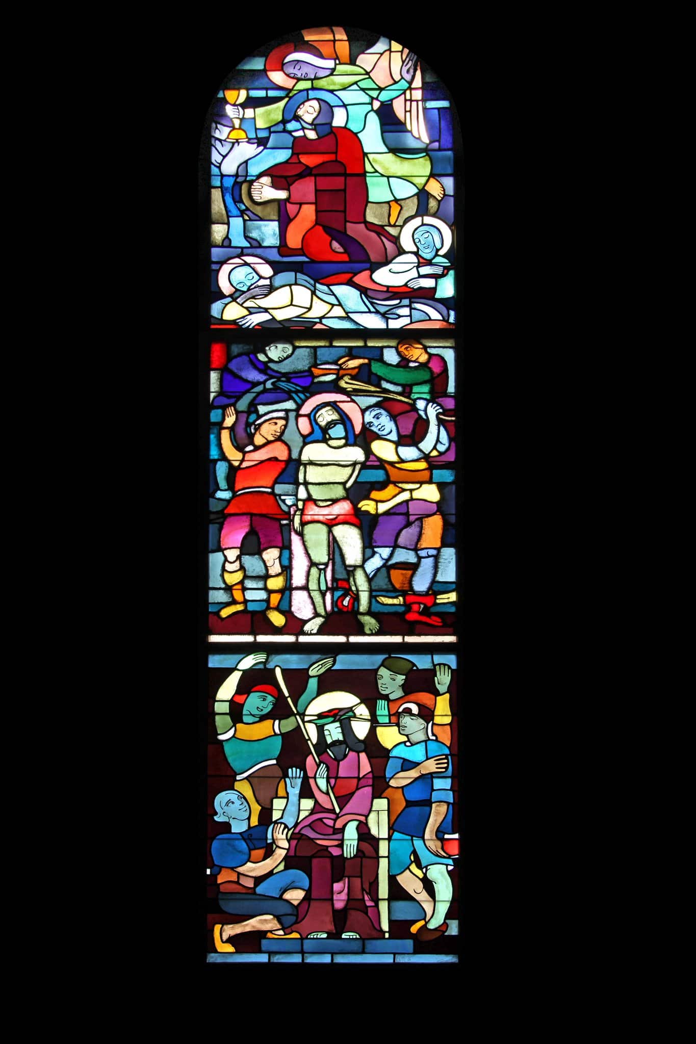 En haut, Jésus prie au Jardin des Oliviers. Un ange lui apparaît et lui offre une coupe alors que deux apôtres dorment au premier plan. Le Christ, les mains attachées à une colonne est flagellé par deux soldats. En bas, Le Christ couronné d’épines et tenant un roseau est entouré de quatre soldats se moquant de lui.