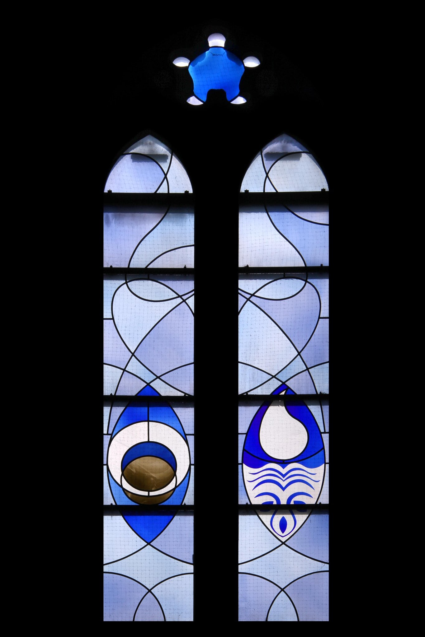 Belle comme la lune, priez pour nous (lancette de gauche). Source scellée, priez pour nous (lancette de droite). Le tout sur un fond bleu avec des courbes dessinées par les plombs.