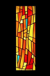 Vitrail non figuratif composé de tons chauds oranges, jaunes et rouges avec des touches de vert et de bleu.