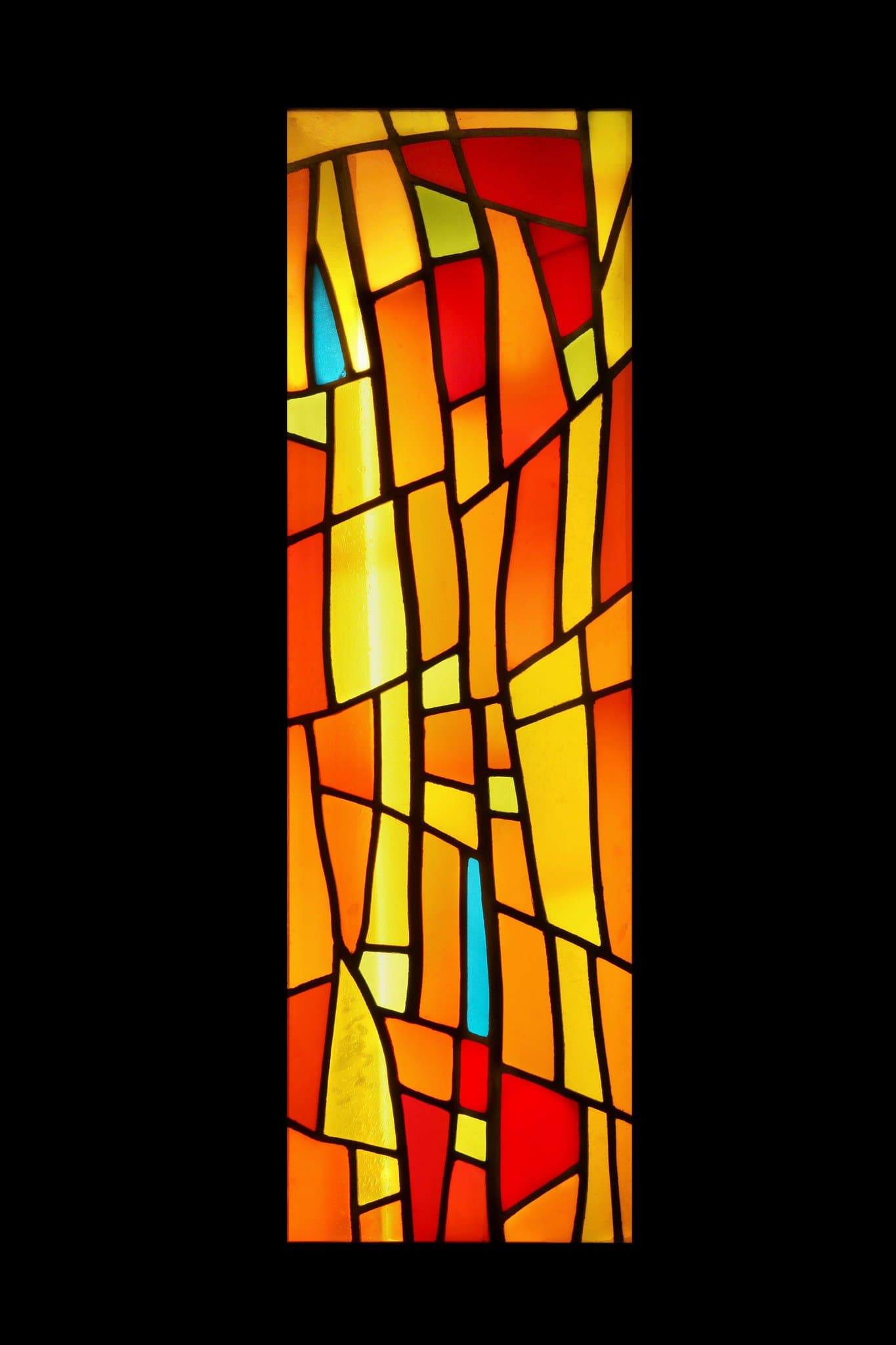 Vitrail non figuratif composé de tons chauds oranges, jaunes et rouges avec des touches de vert et de bleu.