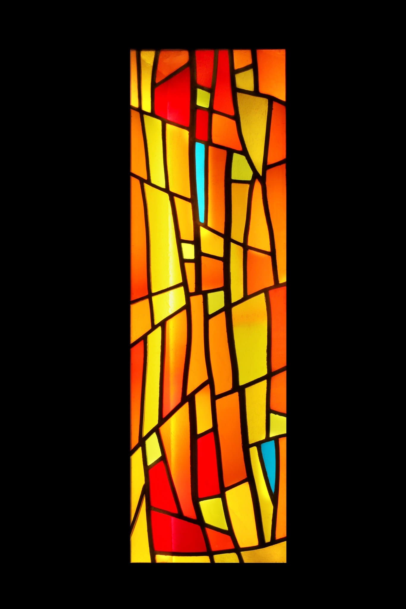 Vitrail non figuratif composé de tons chauds oranges, jaunes et rouges avec des touches de vert et de bleu.