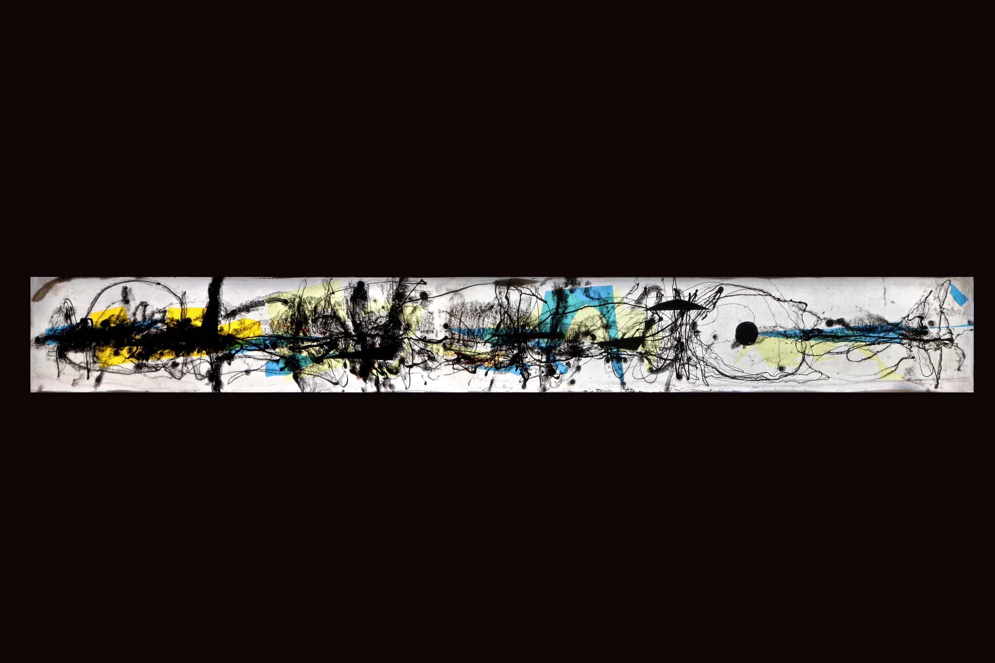 Un dessin et des lignes noires sur un décor jaune et bleu sur fond blanc.
