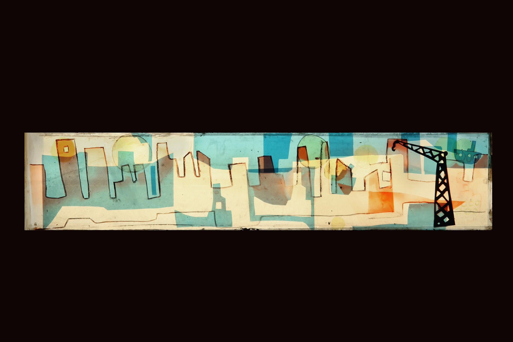 Des immeubles illuminés par plusieurs soleils se dressent vers le ciel. A droite une grue. Au fond plusieurs bateaux flottent sur l’eau.