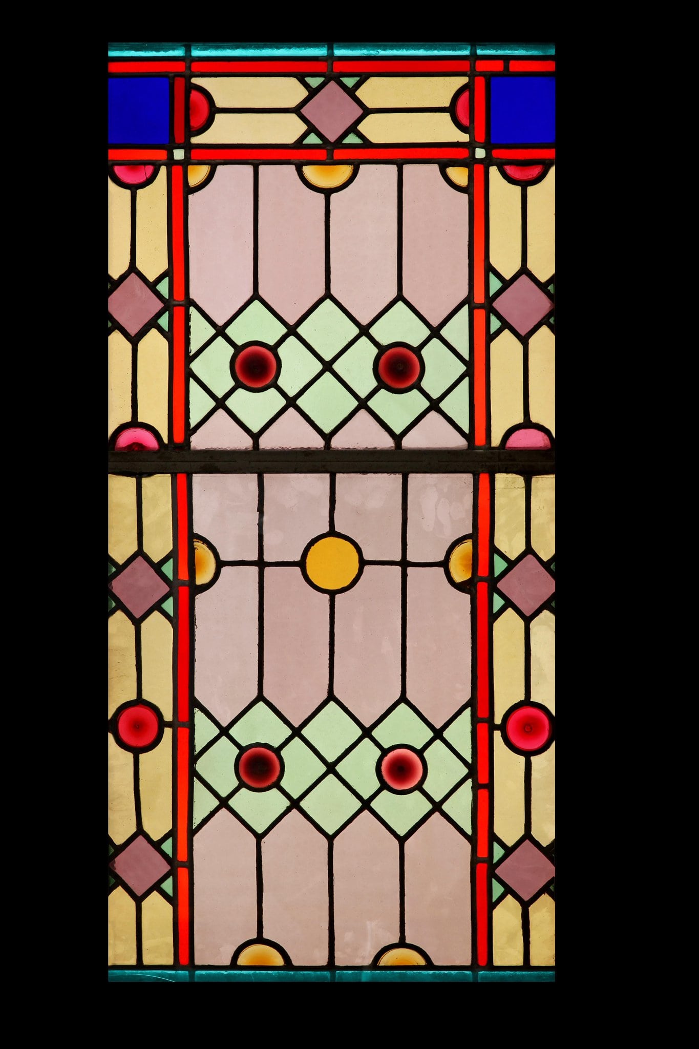 Vitrail géométrique composé de verres clairs et de culs de bouteille. Dans les angles supérieurs, deux carrés bleus sans dessin.