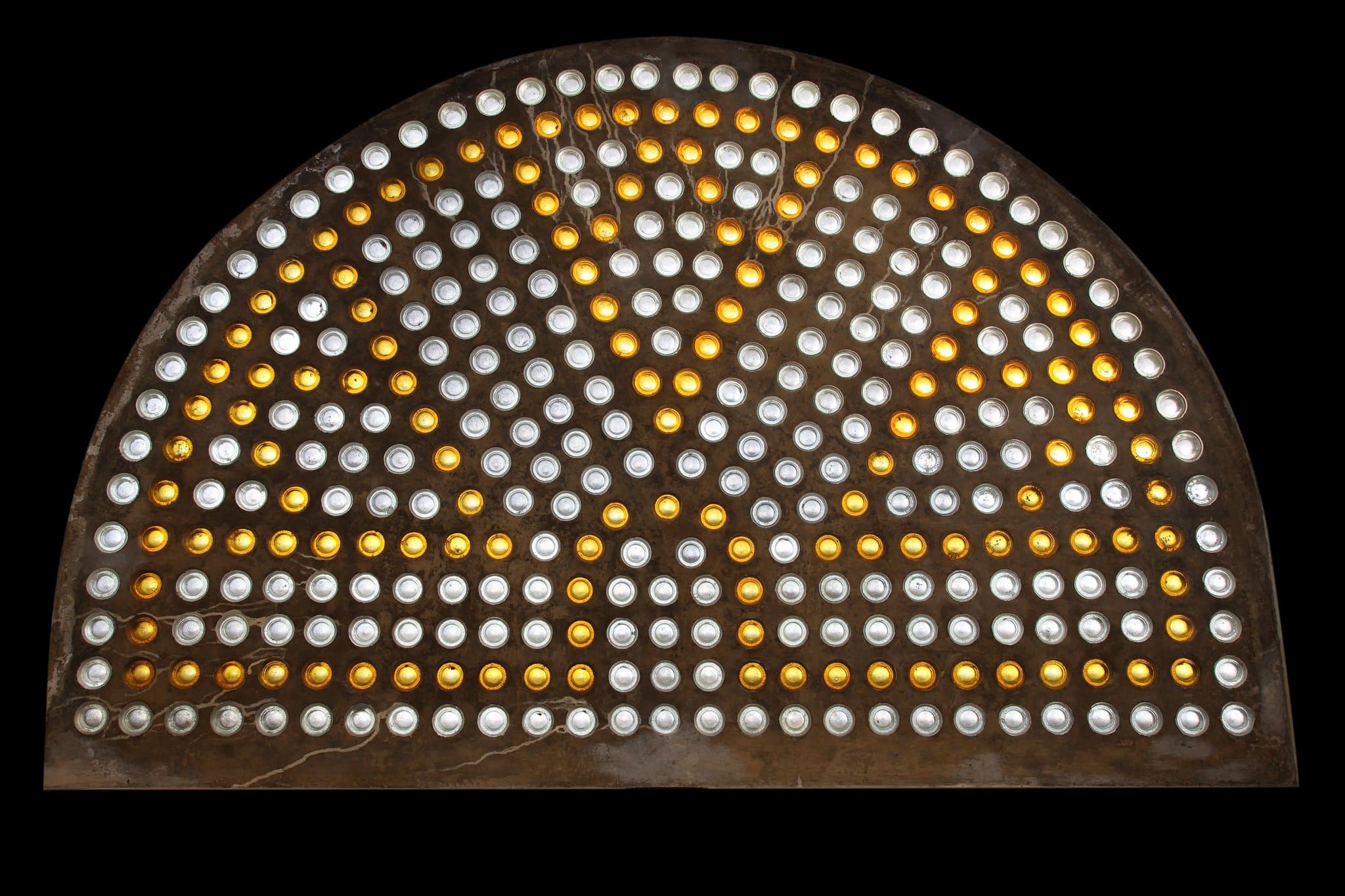 Un toit plat en demi-cercle composé de béton et d’insertions de pavés de verre ronds blancs et jaunes orne l’entrée de l’immeuble.