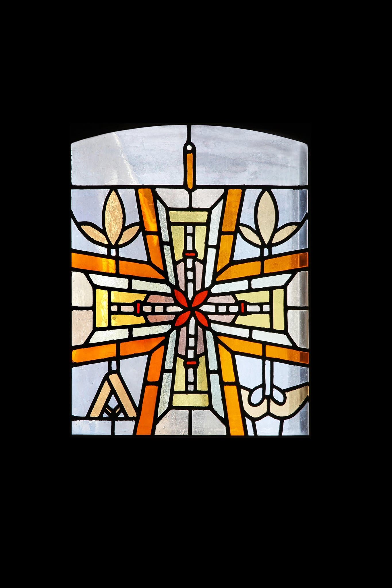 Une croix pattée entourée de feuilles d'olivier dans sa partie supérieure et de l'alpha et l'oméga en bas.