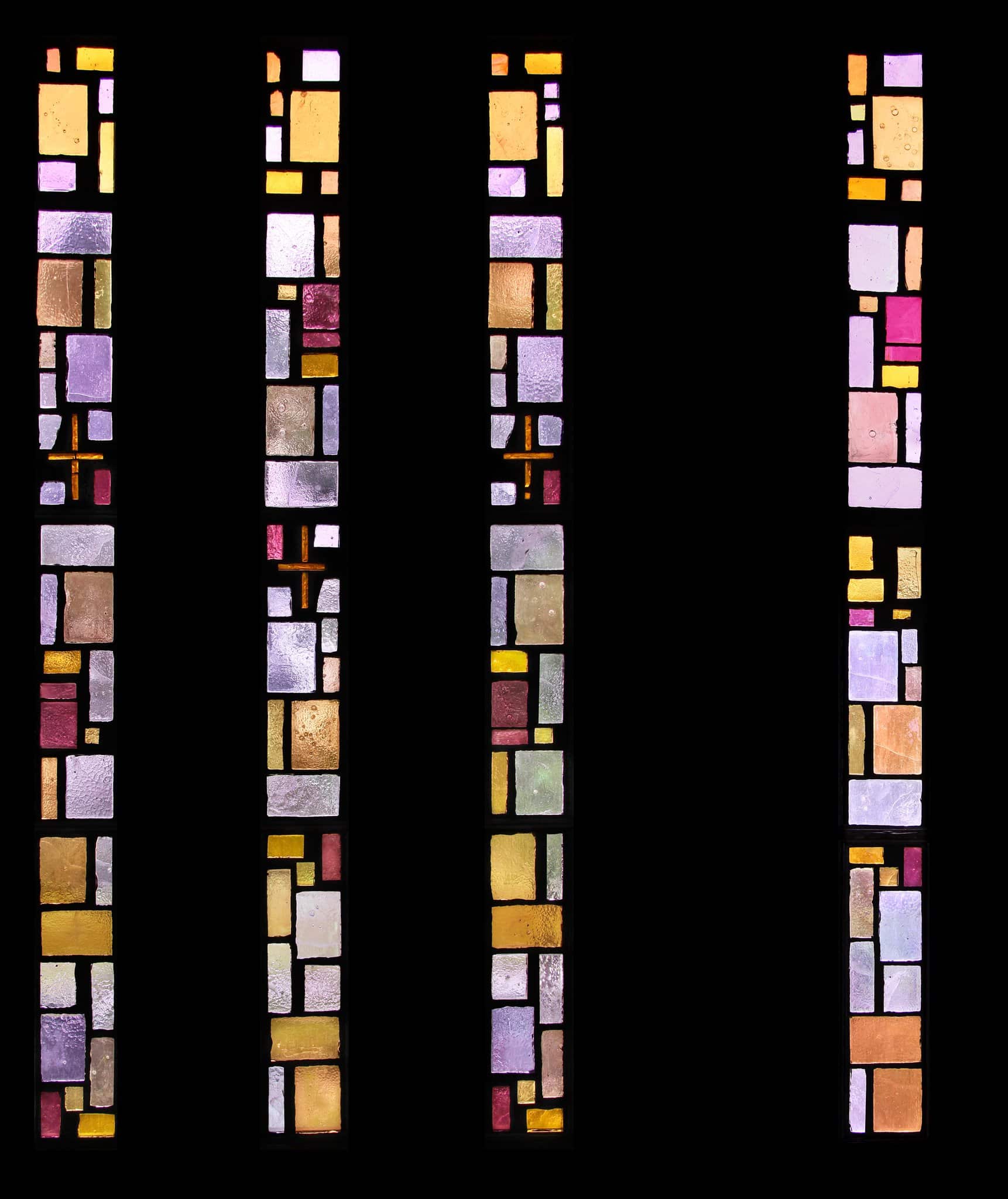Dalle de verre abstraite composée de quatre baies étroites aux teintes beige, jaune, mauve, rose et blanche. Une petite croix brune symbolisant une station du chemin de croix figure à des hauteurs différentes au milieu des trois premières ouvertures.