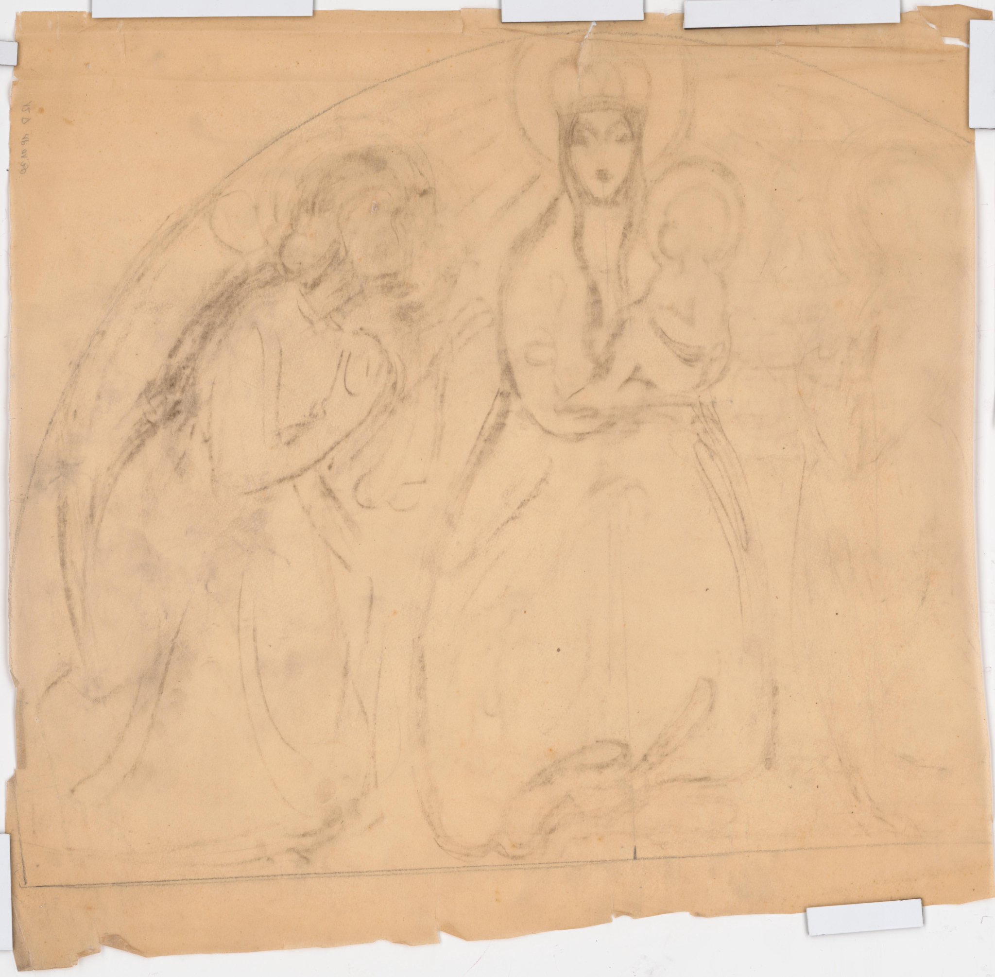 Ce travail préparatoire a été réalisé par Marcel Poncet en 1915 pour le vitrail dédié à la Vierge (GE_08.10), situé dans le bas-côté sud-est de l'église Saint-Paul de Cologny (GE), dans le quartier de Grange-Canal. Il correspond à la partie supérieure du vitrail dédié à Marie, représentant la Vierge à l'enfant en gloire dans le ciel.