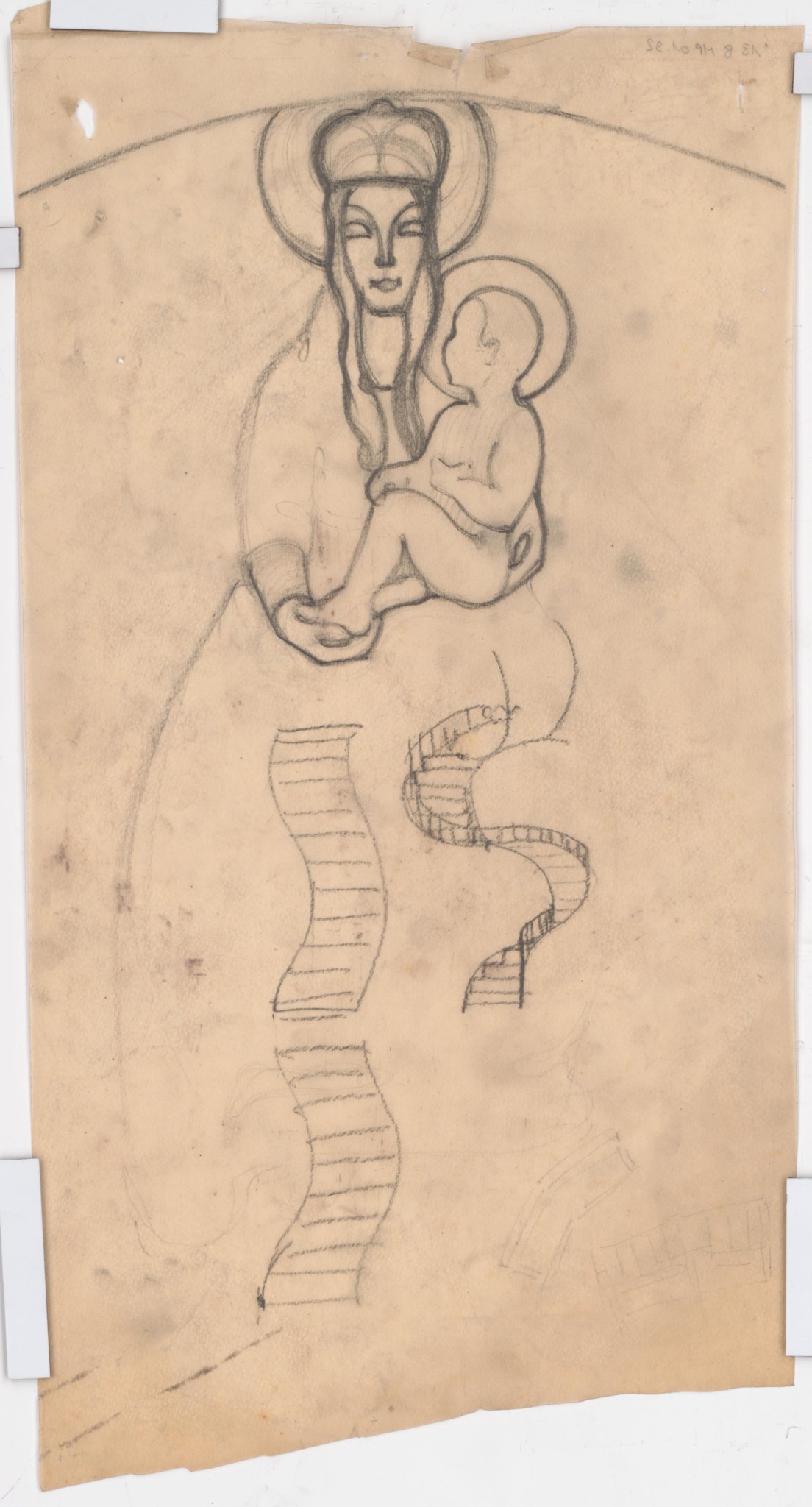 Plus de 70 projets peuvent être rattachés aux vitraux de Saint-Paul, et 51 aux trois vitraux des bas-côtés, mais l’ensemble n’est probablement pas complet. Pour le vitrail de la Vierge, il existe 21 oeuvres graphiques, dont sept esquisses qui peuvent être rattachées à la scène supérieure (MP_01.31 ; MP_01.32 ; MP_01.33 ; MP_01.34 ; MP_01.35 ; MP_01.67). Celle-ci est probablement parmi les premières qu'il réalise pour cette scène, dans laquelle il étudie la figure de la Vierge à l'enfant. Une fois ses personnages et sa composition fixée, il réfléchit sur d'autres travaux au positionnement du futur réseau de plombs (MP_01.34), et même au travail de la grisaille pour créer la texture et des jeux d'ombre et de lumière sur les nuages et les tissus (MP_01.35). Cette esquisse comporte également trois essais pour un escalier correspondant à celui figurant dans la scène centrale du vitrail, représentant l'Annonciation. La présence de ces croquis étrangers à la représentation de la Vierge indique que l'artiste a travaillé ses trois scènes de manière parallèle. Avant d'opter pour l'escalier droit présentant une légère ondulation visible dans l'oeuvre verrière, il a hésité avec un escalier à vis, comme le démontrent cette esquisse ainsi que d'autres travaux préparatoires pour l'Annonciation (par exemple MP_01.39 ; MP_01.47).