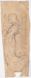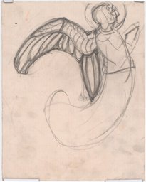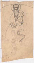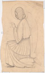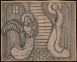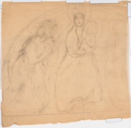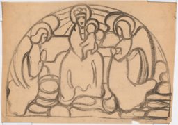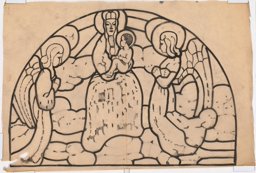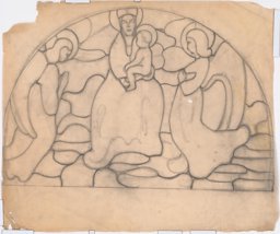 Esquisse de vitrail en plein cintre avec trois scènes narratives encadrées d'une bordure. Dans le registre du haut, la Vierge à l'enfant est entourée de deux anges de profil de chaque côté. Au centre, figure la scène de l'Annonciation, avec Gabriel agenouillé de profil à gauche, et la Vierge lui faisant face debout à droite, les genoux fléchis, avec dans le fond de la scène un grand escalier sinueux. En bas, à peine esquissée, se trouve la scène de la présentation de Jésus à Siméon au temple, avec Siméon debout à gauche et la Vierge agenouillée au centre lui tendant le Christ enfant, et Joseph debout à droite. Deux anges stylisés sont représentés sur les côtés.