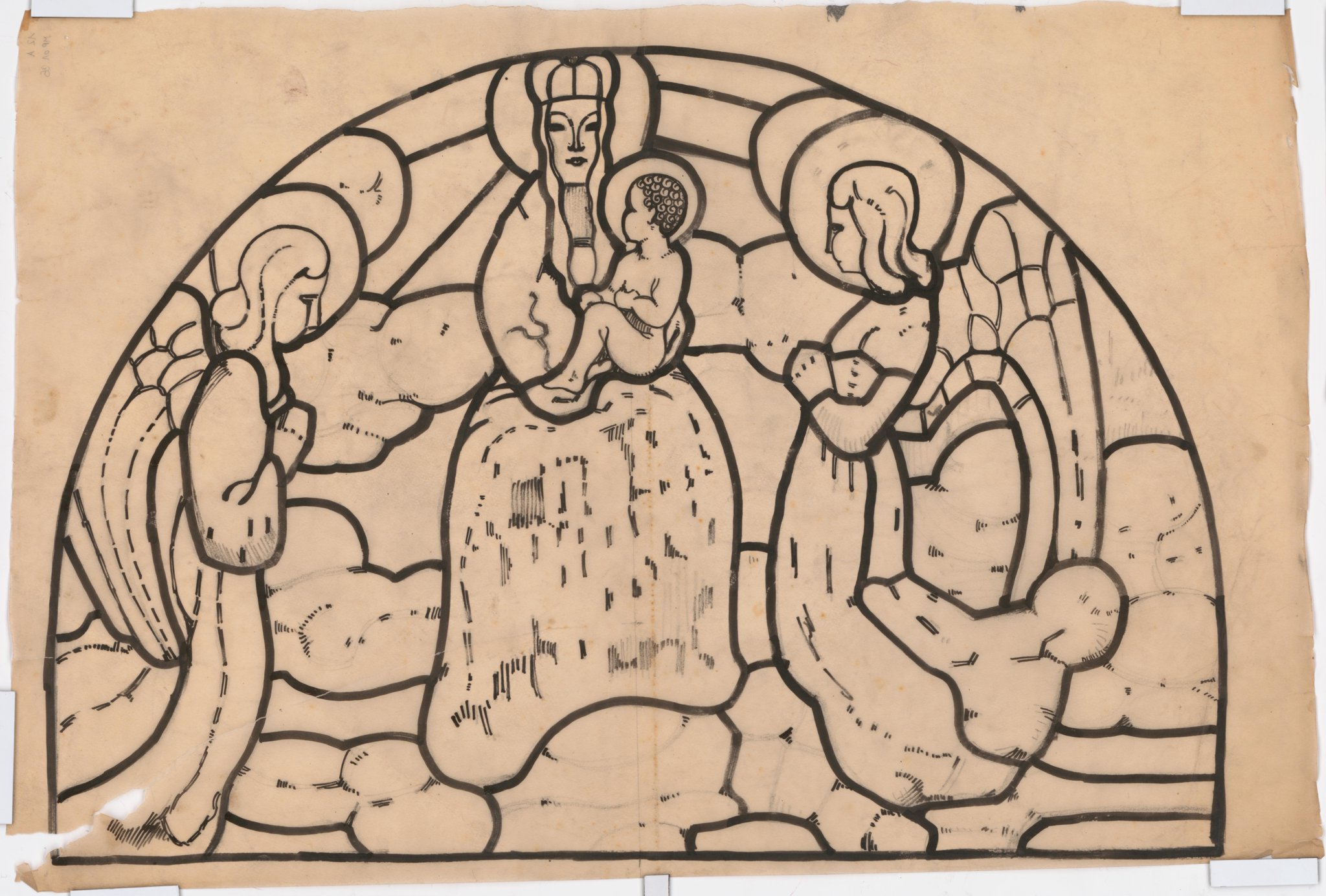 Sur ce projet, l'artiste a déjà fixé sa composition, la position et l'attitude de ses personnages, qui diffèrent peu du vitrail final. Il définit par des traits de contour plus importants le futur tracé des plombs et envisage également le travail de la grisaille pour créer de la texture ainsi que des jeux d'ombre et de lumière sur les nuages et les tissus, par de petites hachures qu'il traduira sur le verre avec un travail très minutieux à la grisaille.