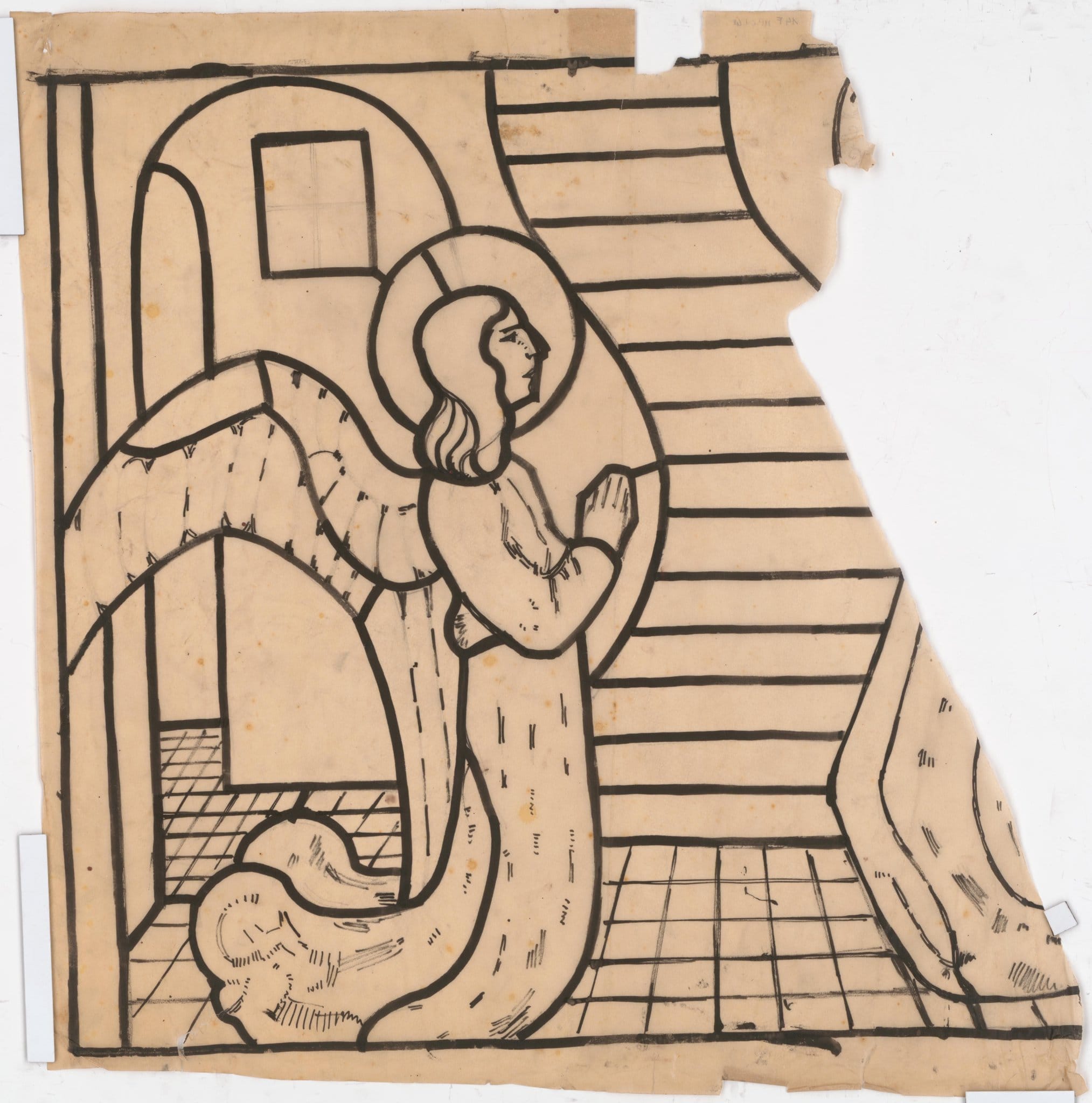 Ce travail préparatoire a été réalisé par Marcel Poncet en 1915 pour le vitrail dédié à la Vierge (GE_08.10), situé dans le bas-côté sud-est de l'église Saint-Paul de Cologny (GE), dans le quartier de Grange-Canal. Il correspond à la partie médiane du vitrail, représentant l'Annonciation.
