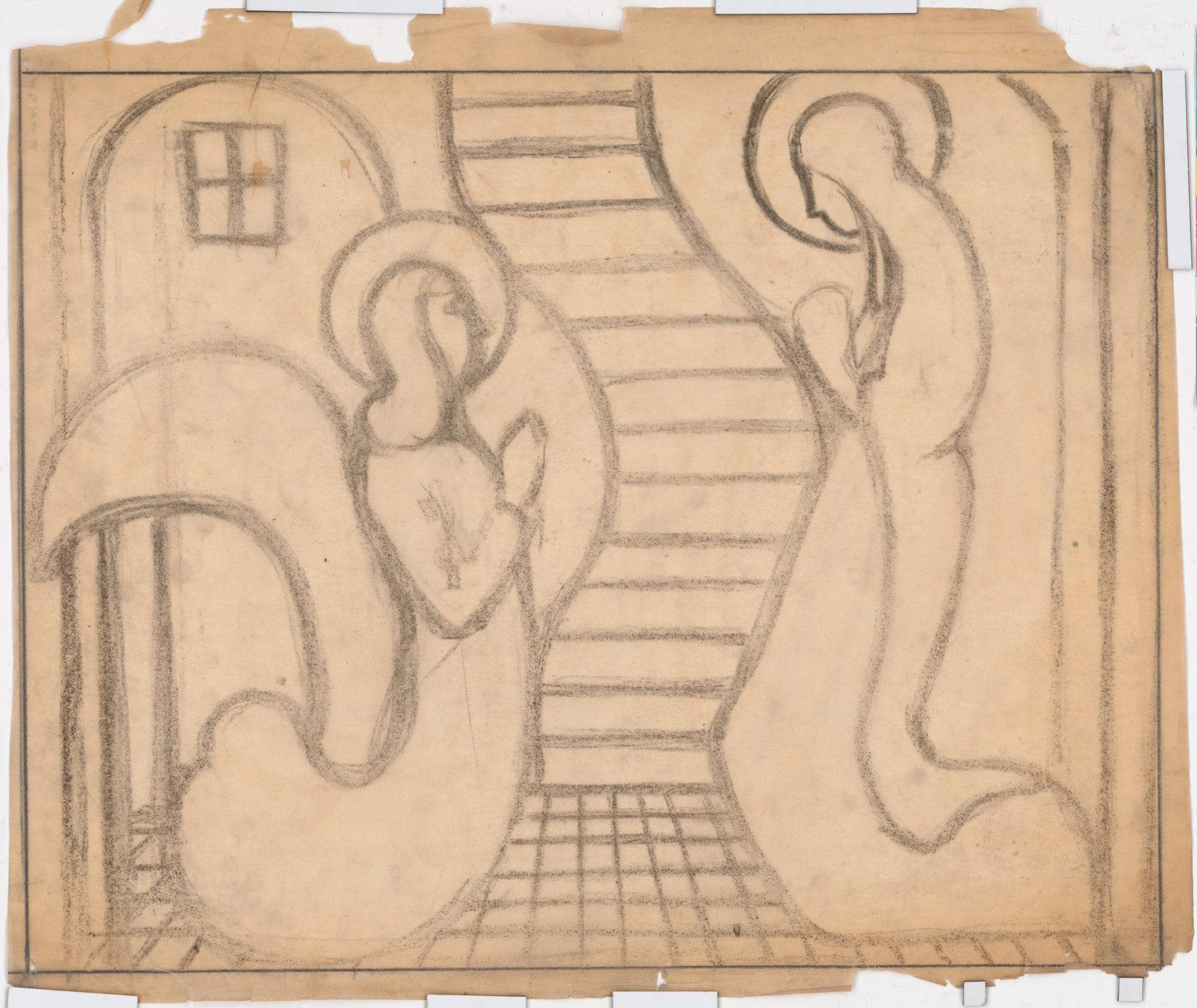 Celle-ci correspond à une étape assez aboutie de son projet, car la composition est très similaire au vitrail. Poncet cherche ici à définir de manière générale les contours des éléments et des personnages, en réfléchissant à l'emplacement du futur réseau de plomb. Deux autres dessins au crayon sur calque (MP_01.46 et MP_01.47) correspondent à la même étape de réalisation, avec des variations dans la précision des éléments représentés.
