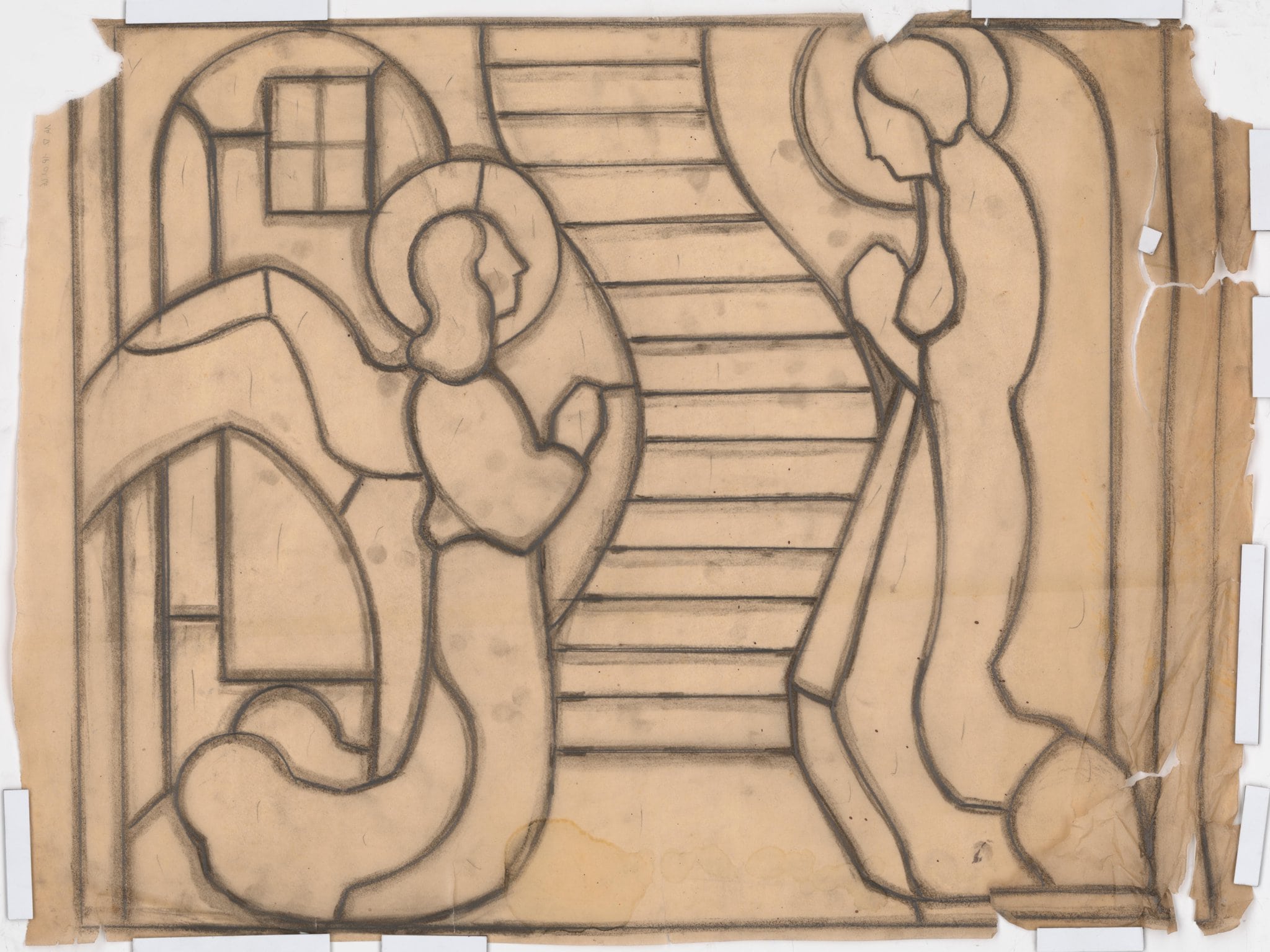 Ce travail préparatoire a été réalisé par Marcel Poncet en 1915 pour le vitrail dédié à la Vierge (GE_08.10), situé dans le bas-côté sud-est de l'église Saint-Paul de Cologny (GE), dans le quartier de Grange-Canal. Il correspond à la partie médiane du vitrail, représentant l'Annonciation.