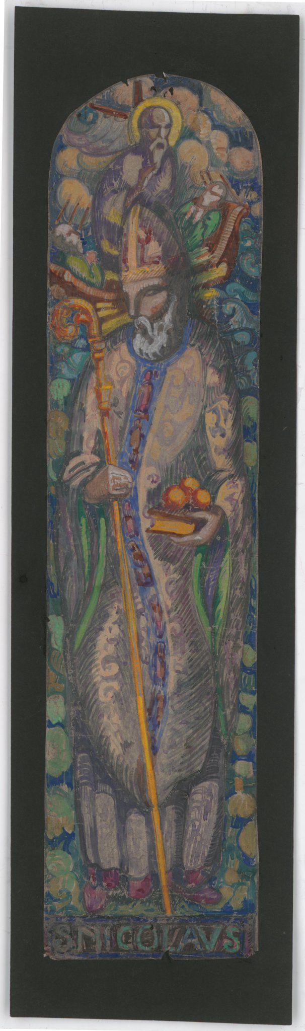 Poncet réalise deux maquettes pour le vitrail de saint Nicolas (MP_03.05 et MP_03.09) qui traduisent deux conceptions très différentes. Dans la première, MP_03.05 le saint occupe moins de place et l'aspect décoratif est très présent. La composition est également plus narrative et didactique, avec les trois petits enfants dans le saloir et le saint apparaissant une seconde fois dans la partie supérieure pour calmer la tempête. Poncet semble ensuite se tourner vers une composition moins narrative, où l'expressivité et le caractère du saint sont renforcés, tandis que le seul élément didactique, le saint calmant la tempête, est relégué au sommet du vitrail. C'est cette formule qui sera conservée dans les cartons définitifs (MP_03.12 et MP_03.18).