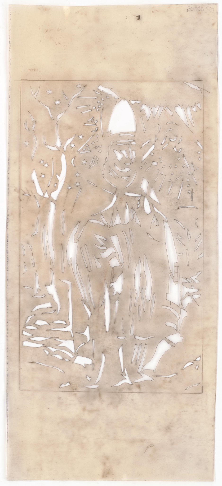 Ce travail préparatoire a été réalisé dans le cadre d'une commande de vitraux pour la chapelle du Collège de l'Abbaye de Saint-Maurice en Valais. Cette chapelle est remaniée par l'architecte Adolphe Guyonnet au cours de l'année 1926. La commande des vitraux est adressée à Marcel Poncet, par l'intermédiaire de son frère le Chanoine Louis Poncet. L'artiste réalise de petits vitraux en simples carreaux de verres jaunes et or à l'antique, avec de petits panneaux comprenant cinq Docteurs de l'Église traités en noir comme des gravures, en alternance avec des médaillons décoratifs. Le reste de la décoration est réalisée par des membres du groupe de Saint-Luc (PONCET, 1926, pp. 147-149 ; LONFAT, 2006, p. 131 ; REYMOND, 1992, pp. 56, 168).