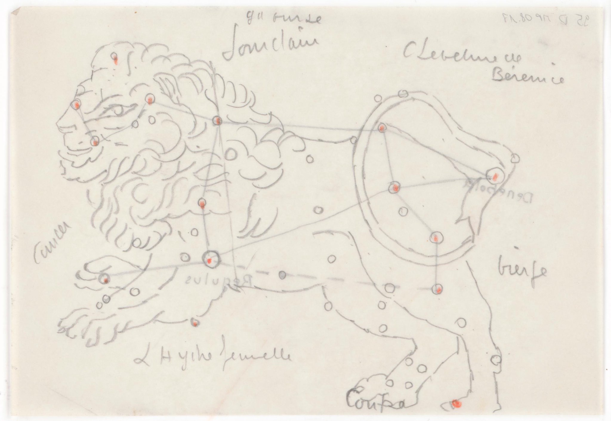 Étude pour des vitraux sur le thème de la "carte du ciel": le Lion représenté de profil. La figure suit le tracé des étoiles et des lignes de sa constellation (dessinées au crayon au verso).