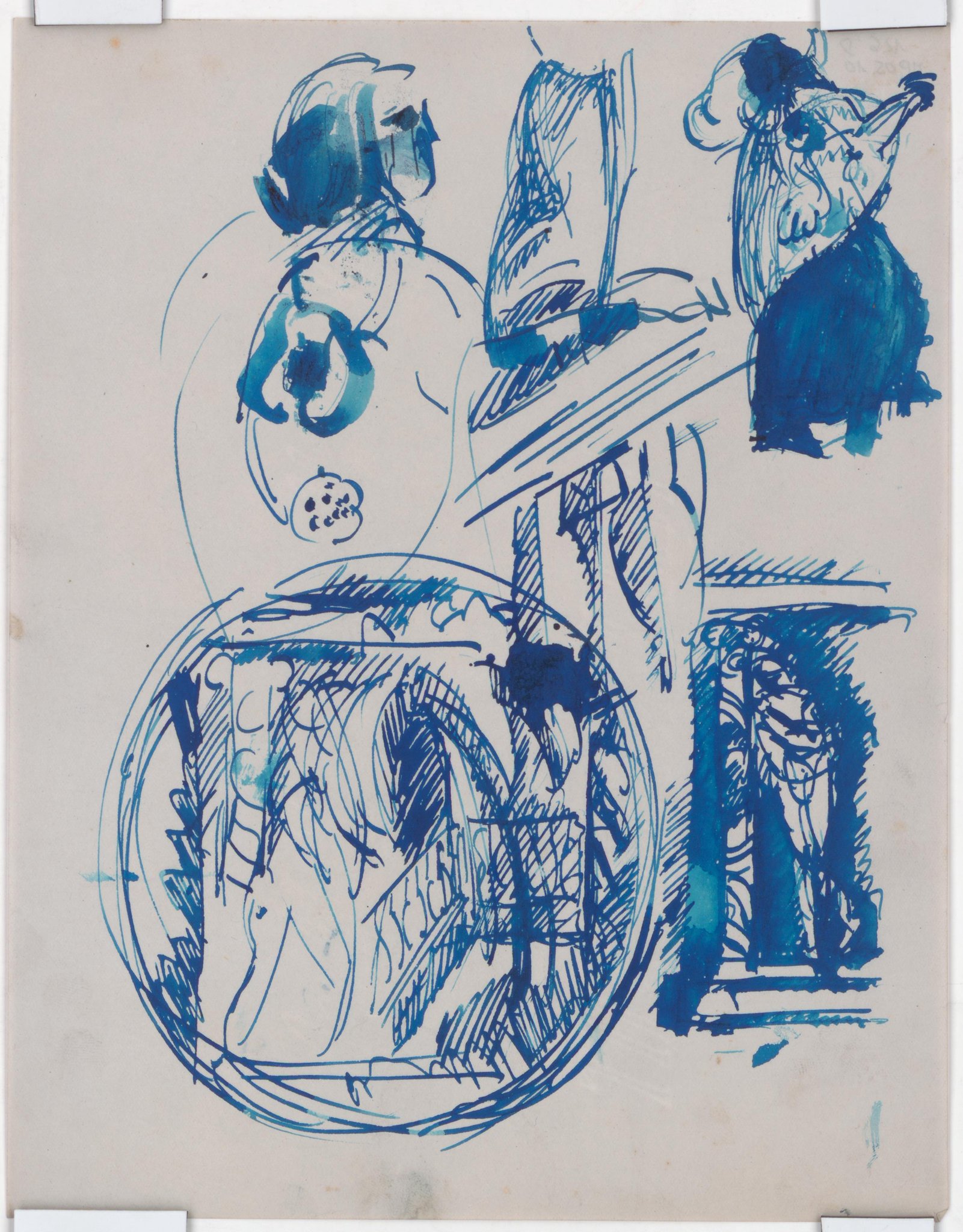 En haut, figure féminine de profil (Élisabeth ?) montant un escalier, à gauche détail de la tête, à droite en entier. En bas, esquisse de l'ensemble du vitrail, avec les deux personnages séparés par un grand escalier. En bas à droite, détail d'un personnage féminin debout (Marie ?).