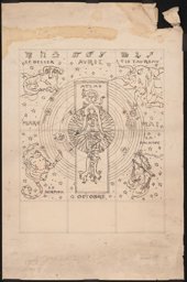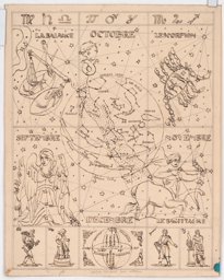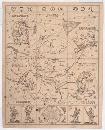 Carte du ciel avec le zodiaque, les constellations, les symboles des signes du zodiaque, la rose des vents et des personnifications des mois