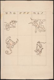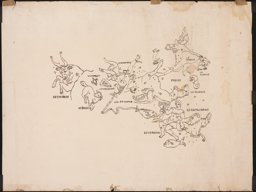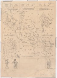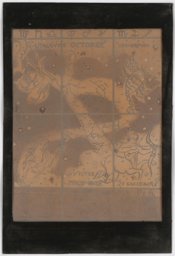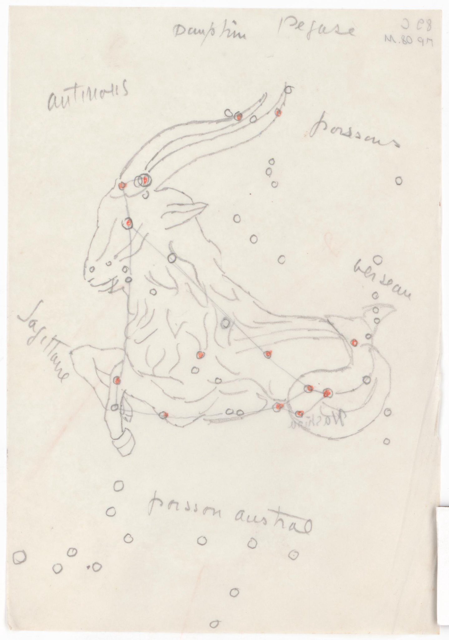 Étude pour des vitraux sur le thème de la "carte du ciel" : le Capricorne couché, à queue de poisson. La figure suit le tracé des étoiles et des lignes de sa constellation (dessinées au crayon au verso).