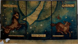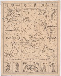 Carte du ciel en frise avec le zodiaque au centre des personnifications des mois (février à mai) et symboles zodiacaux