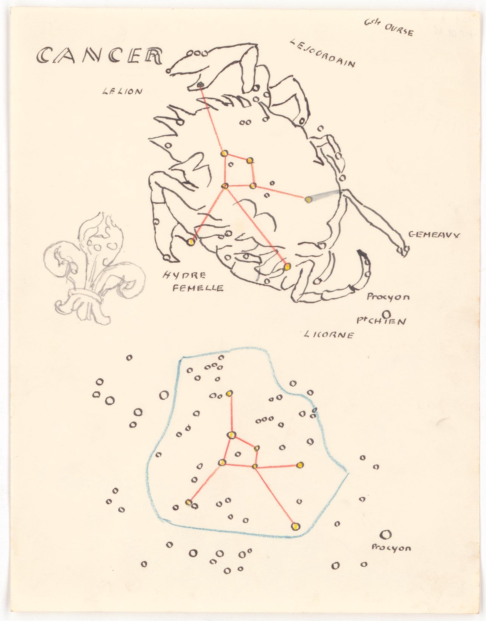 Étude pour des vitraux sur le thème de la "carte du ciel": le Cancer en haut, tourné vers la gauche. La figure suit le tracé de sa constellation, dessinée en rouge, les étoiles en jaune. A gauche au crayon, esquisse de la constellation de la Fleur de Lys. En bas, la constellation du Cancer délimitée en bleu, entourée des autres étoiles.