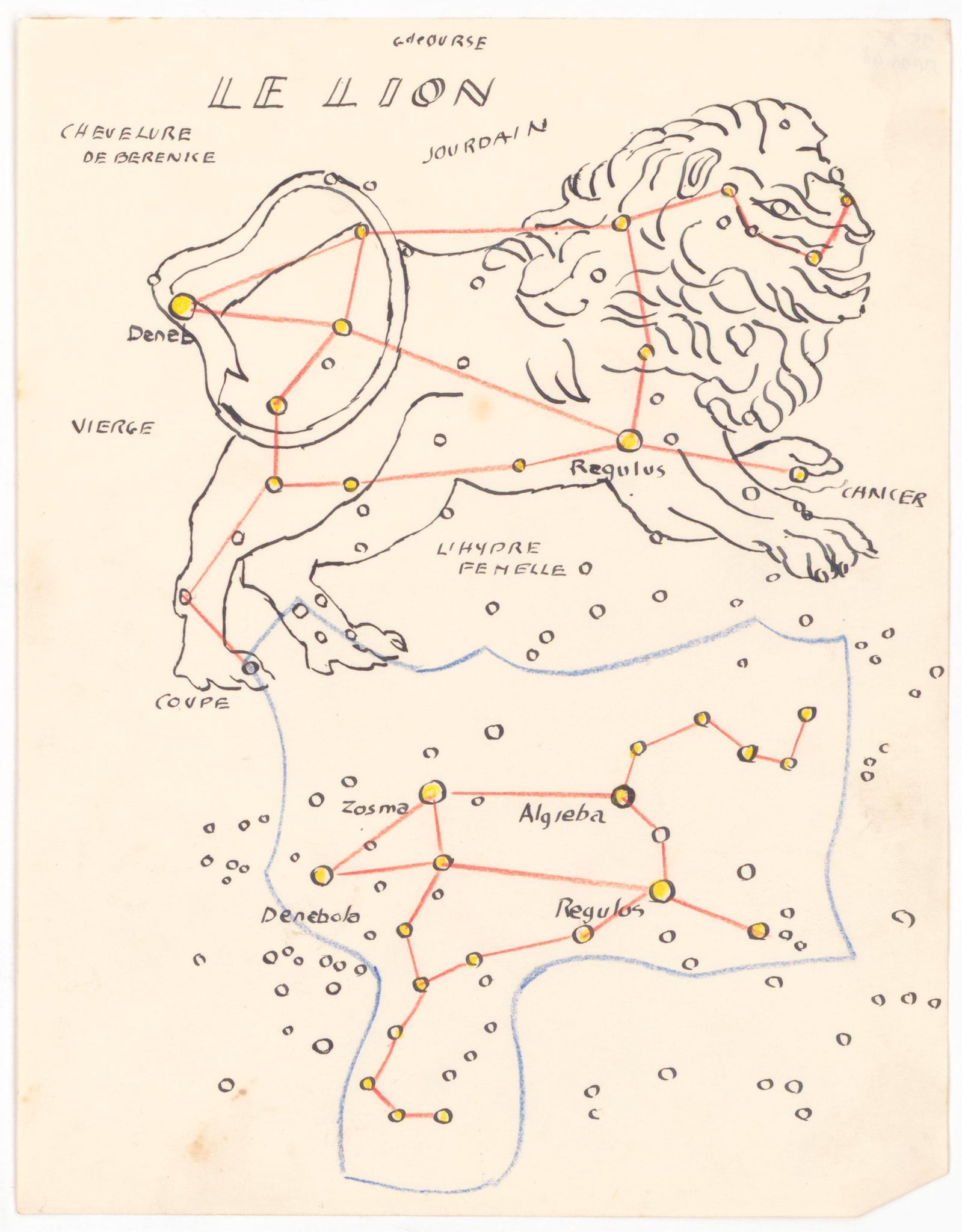 Étude pour des vitraux sur le thème de la "carte du ciel": le Lion en haut, dirigé vers la droite. La figure suit le tracé de sa constellation, dessinée en rouge, les étoiles en jaune. En bas, la constellation délimitée en bleu, entourée des autres étoiles.